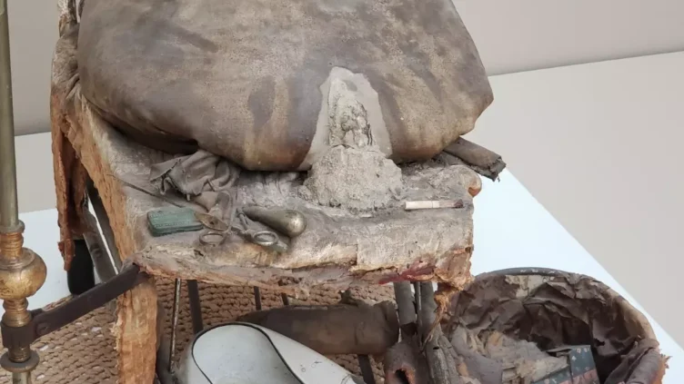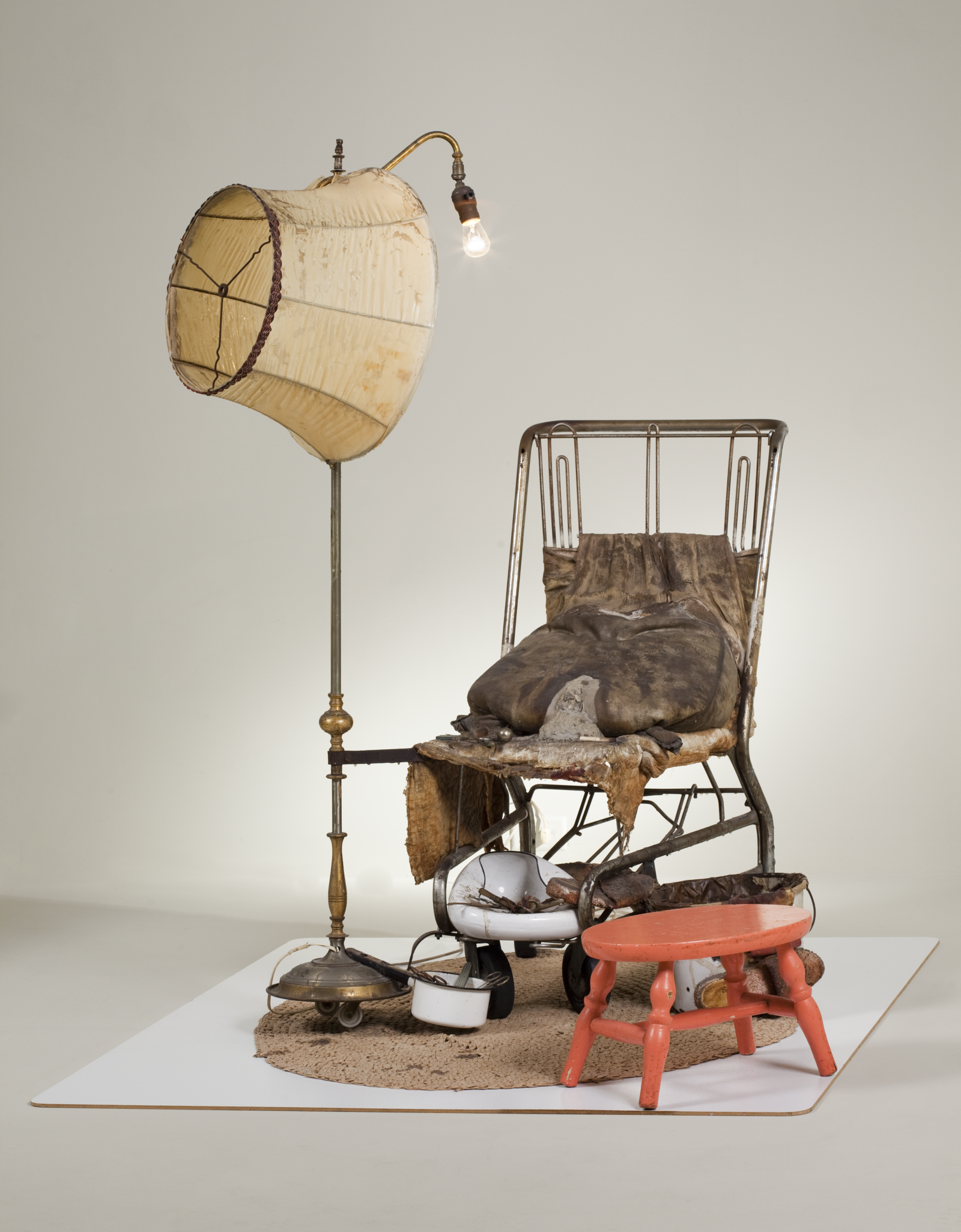 A literal nature morte, The Illegal Operation conjures the scene of a makeshift operating theatre. Judging from its state of dereliction, the surgeon has recently departed, while the patient’s body is substituted by a sack of cement slumped in the center of a metal wheelchair that seems to have been adapted from a dismembered shopping cart. This wheelchair-cum-gurney is strapped and bolted to a floor lamp, its tautness echoing how the sack’s excess fabric has been stretched around the chair’s thin metal slats, emphasising themes of restraint and bondage. The cement sack is marred by a small cut from which its contents spill forth, forming a small pyramid of industrial surplus. The only index of the surgeon’s presence is a half-smoked cigarette, left casually next to the incision site. Strewn about the base of the wheelchair are a white metal bedpan and saucepan filled with dirty and rusted surgical instruments and a metal paint can stuffed with what appear to be bloodstained rags that are tinged brown from oxidation. Wedged behind this gory paraphernalia is a single fuzzy pink slipper streaked with grey cement, yet another piece of evidence, this one belonging to the patient/victim, suggesting her rushed, or perhaps fatal departure. A coral-colored wooden stool stationed in front of the wheelchair offers the amateur surgeon a perch during the operation, and we can envision him (or her) exhaling cigarette smoke into the pregnant woman’s stomach and groin as he worked. The glare of a bare lightbulb enhances the mood of coercion, impropriety, and violation, more befitting a torture chamber, fetish porn, or a post-mortem than a medical procedure.