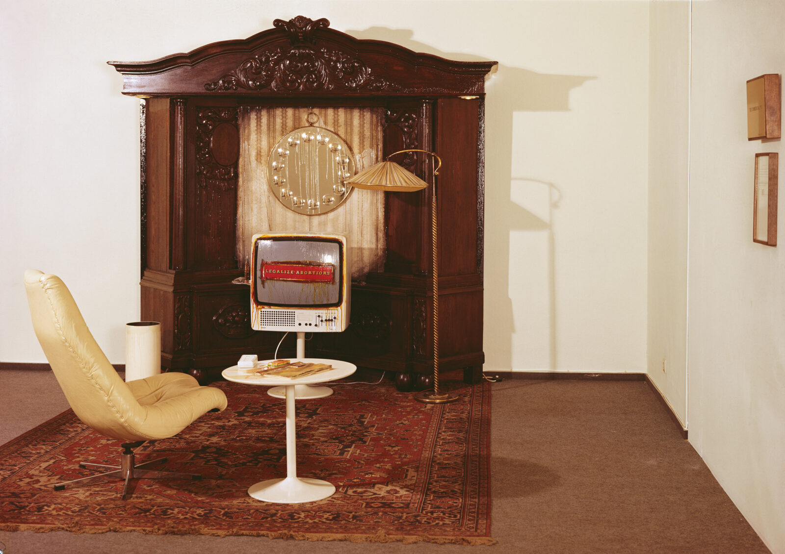 The ambiguous ethics of The Illegal Operation come into clearer view when considered alongside a second abortion tableau that Kienholz completed in the lead-up and immediate outcome of Roe v. Wade in January 1973, the same year he and Nancy moved to Idaho. Like The Illegal Operation a decade earlier, The Commercial #2 (1971–73) is a domestic scene that positions abortion and its criminalization at the collapsed intersection of public and private. Ed Kienholz initially created The Commercial #2 in 1965, as part of his Concept Tableau series of conceptual proposals. He executed the work in 1973, in the immediate lead up to and aftermath of Roe’s passing. Like its predecessor, The Illegal Operation, The Commercial #2 also situates the abortion issue as a matter of contingent spectatorship: a question of not just who is watching, but when, how, and where. The tableau is staged within the archetypal Cold War interior of the middle-class living room and organized around the focal point of a television set, the exemplary postwar mass medium. Once again, Kienholz literalizes the breakdown of public and private experience as a violent confrontation, this time by streaking the TV monitor with a resinous, blood-like substance and intercepting its broadcast with an unusual “commercial”; in fact, a self-produced bright orange bumper sticker attached to the glass screen that bluntly demands: LEGALIZE ABORTIONS. When the television is switched on, the screen glows with blue static, uncannily illuminating the sticker’s slogan. By staging the television as the site of around-the-clock access to public discourse and consumer culture, like a portal to “the commercial” realm, Kienholz exploits its role as domesticated mass media to advertise his message, much in the way The Illegal Operation scrambles public and private experience to generate a visceral condemnation of moral hypocrisy.