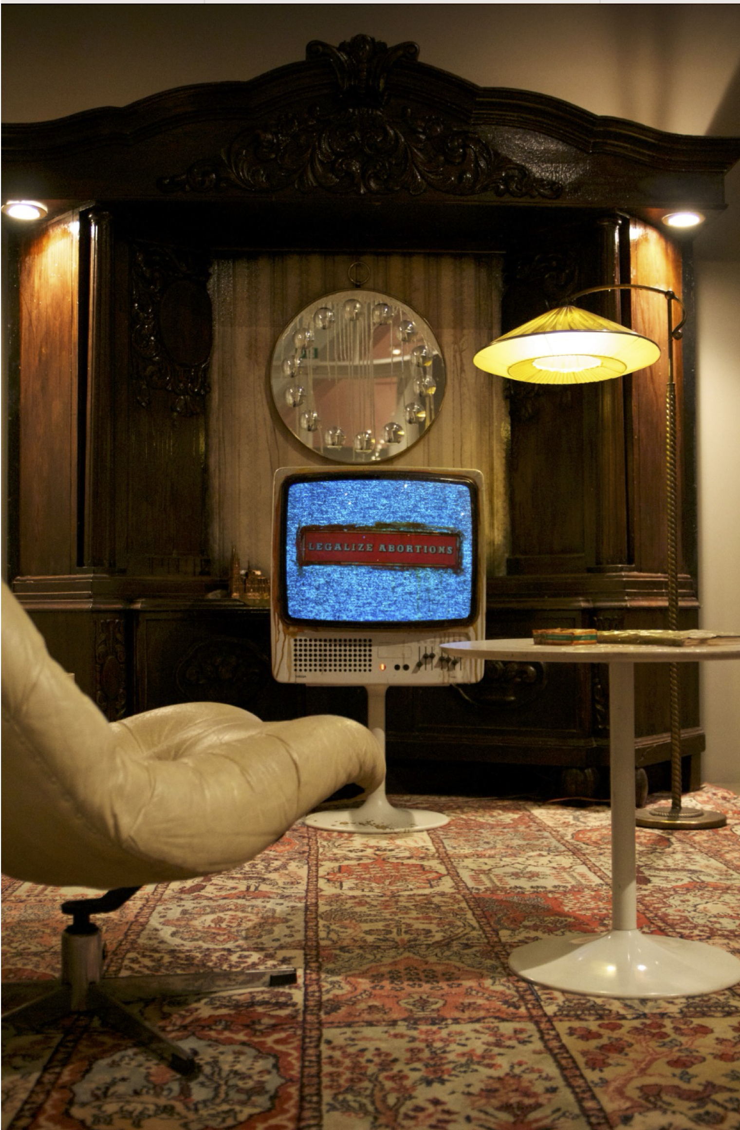The Illegal Operation and The Commercial #2 both discursively reframe abortion, converting it from a “women’s issue” to a problem of representation and, specifically, a problem of representational politics in the public sphere. Situated historically from “before” to “after” Roe, the two works could be seen to function chiastically: whereas The Illegal Operation publicizes a private episode, distributing individual shame across the social field, The Commercial #2 domesticates the public debate, driving the debate home, into the living room. Neither work questions whether abortions will occur—its existence as a procedure is accepted as an inevitable fait accompli. Instead, the problem is one of whether and how abortion can be represented when it is proscribed both legally and culturally. In both cases, abortion figures as a kind of litmus test for postwar liberal consensus: a limit case for what is considered beyond the pale, what cannot be said or shown in a supposedly modern, advanced, liberal democracy. More subtly, both tableaux prompt a consideration of the tension between abortion access and abortion discourse—in other words, between the right to bodily autonomy and privacy versus the right to free speech, questions that continue to animate the abortion debate post-Roe.