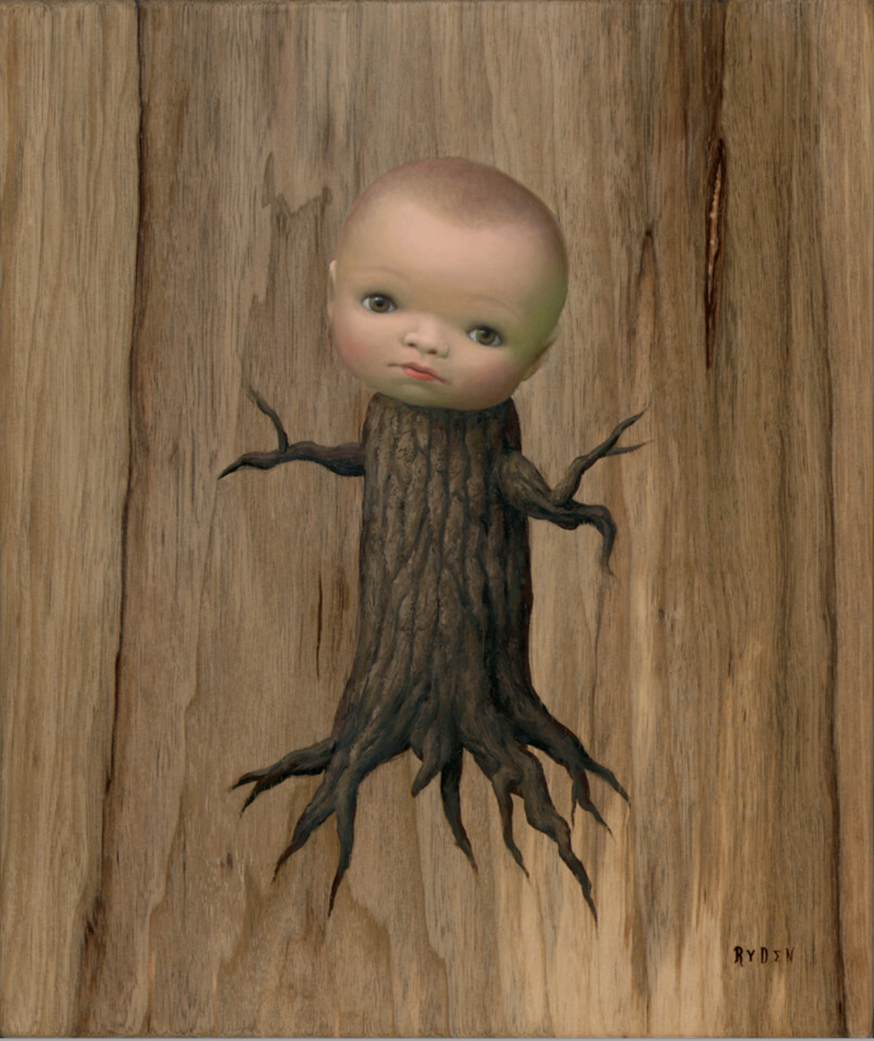 Fetal Trapping was one of Ryden’s series of paintings, “Tree Show,” which had been prompted by the Bush presidency’s permission to log the giant Sequoia National Forest: a triumph of lobbyism. Another Tree Show painting, Stump Baby (2006), a tree stump with a human baby’s head, could emblematize both Lisa Simpson’s endangered early-term forest and the “pro-life” movement’s enduring fear that “unnatural” reproduction technologies (in-vitro fertilization) and genetic engineering will create monsters (figure 2).24