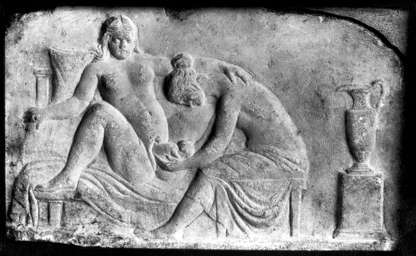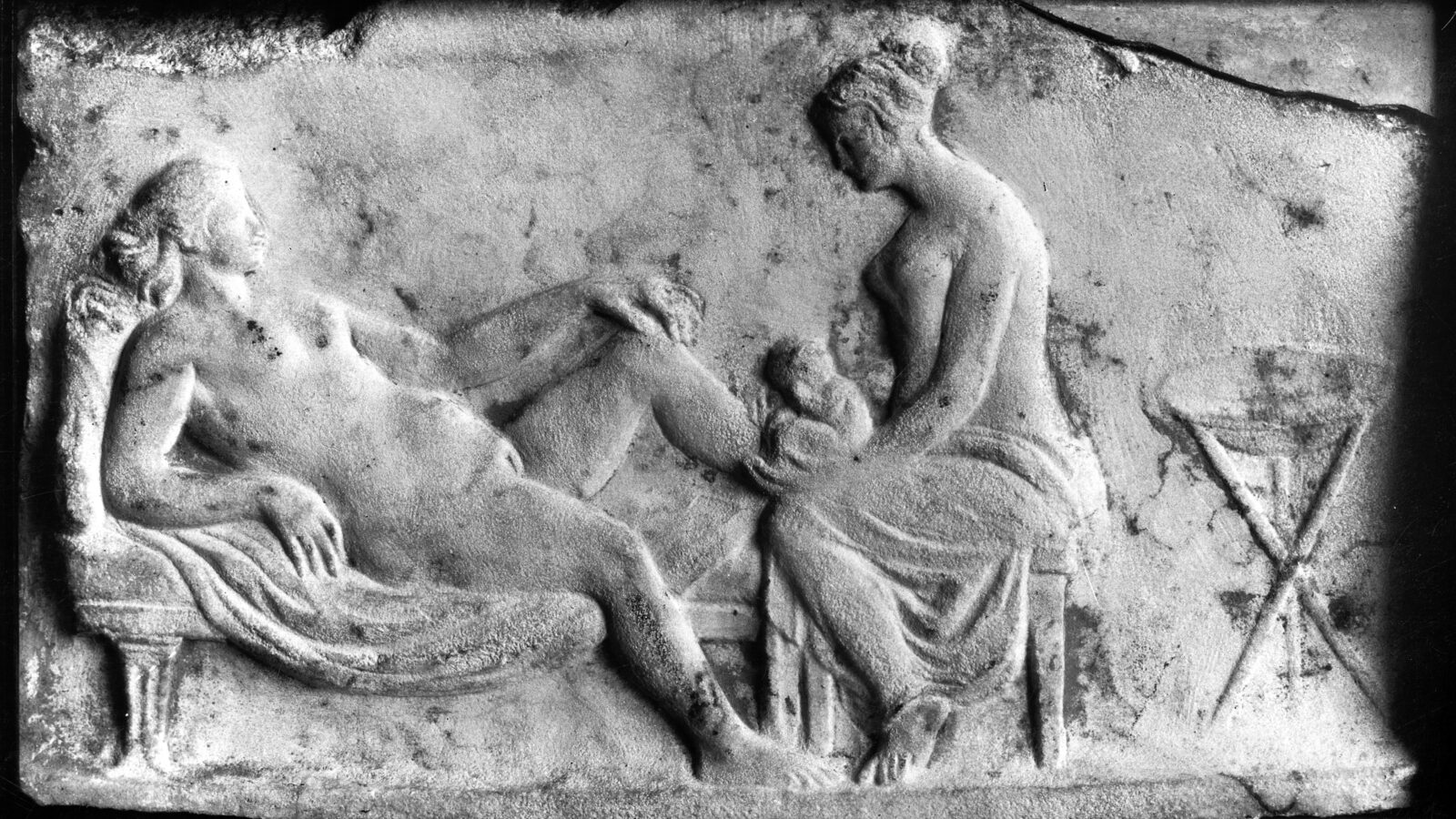 In Ancient Rome, male doctors were summoned during childbirth only if labor proved difficult. Instead, it was midwives who played the literal and figurative role of a physical and emotional support in childbirth—a support captured in the word obstetrix, which comes from the Latin verb obstare, “she who stands in front/opposite.” This defining feature is reflected in representations of midwives, which often depict a midwife positioned before a mother in a posture of support, as in Figure 1. In this poignant scene, a mother grips the back of her kline with her right hand and the midwife’s back with her left. The gesture conveys reliance and trust through a tangible connection between women: the fate of the mother and her child is in the midwife’s hands.