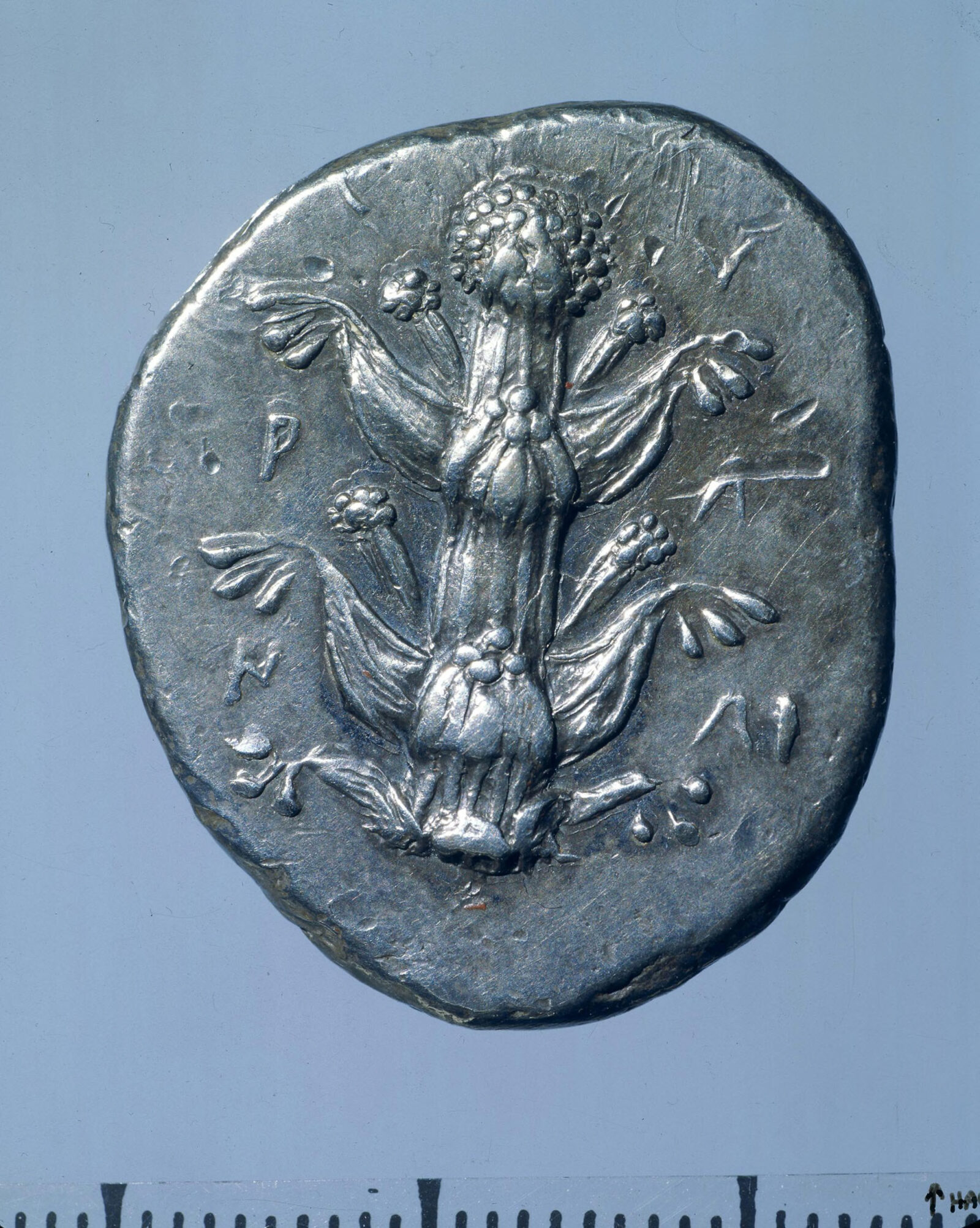These coins served economic, aesthetic, and informational purposes—as wide-traveling currency, as a serialized depiction of the plant recording its constituent parts, and as a testimony to the wide-ranging healing capacities of those different plant parts. Acting as code that was disseminated broadly and below the radar, these bright, shiny, tangible objects of value looked good while doing this critical work. Traversing its diameter, tiers of leaves and flowers peel away from a single stalk to fill the coin’s area. Struck into the silver, the die mark emphasizes the plant’s complex texture—rows of twisting, three-pronged leaves and clumps of round flowers reach out from a thick, fluted stalk. Holding this coin would not only emphasize the weight of its metal, but also the grooves and curves of its image under fingertips, so that one might come to know about silphium through sight and touch. Gathering a handful of such coins multiplies these plant images, approximating dosage by grouping coins. And as these sensorially stimulating objects moved across the wider Mediterranean and its contact cultures, they brought many different people into contact with images of the silphium plant. As with marigold, nothing about the plant’s name or image belies its specific uses, so the coin expands knowledge of silphium across a broad population while keeping specific knowledge of its use quiet.