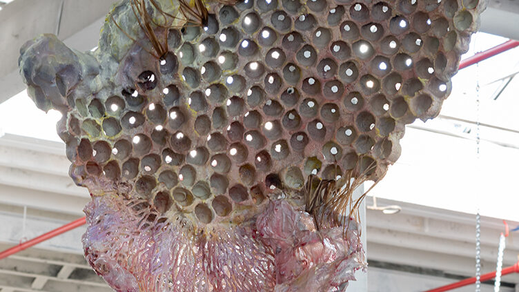 In contrast, Pleasure Trophy I (2024, figure 6) extends brazenly into space, at once probing and softly contoured. Thin rivulets of glossy pink resin drip from a bulbous upper protuberance. Lower down, its horn glitters. Pleasure Trophy I points to pleasures with no relation to the history and performance of hunting trophies. If potency, as opposed to impotence, is often signified in a trophy, then the Pleasure Trophies possess a potency that remains free of the demands of social reproduction and the law.