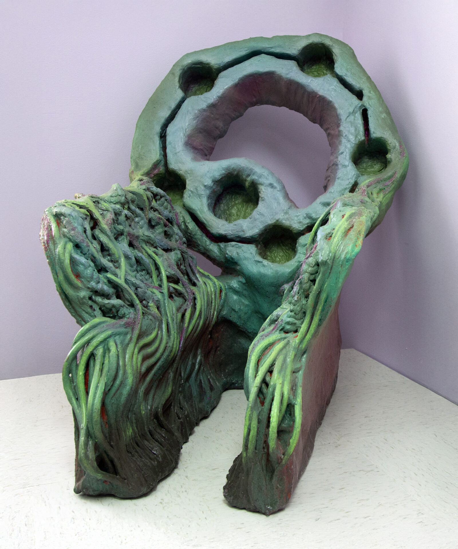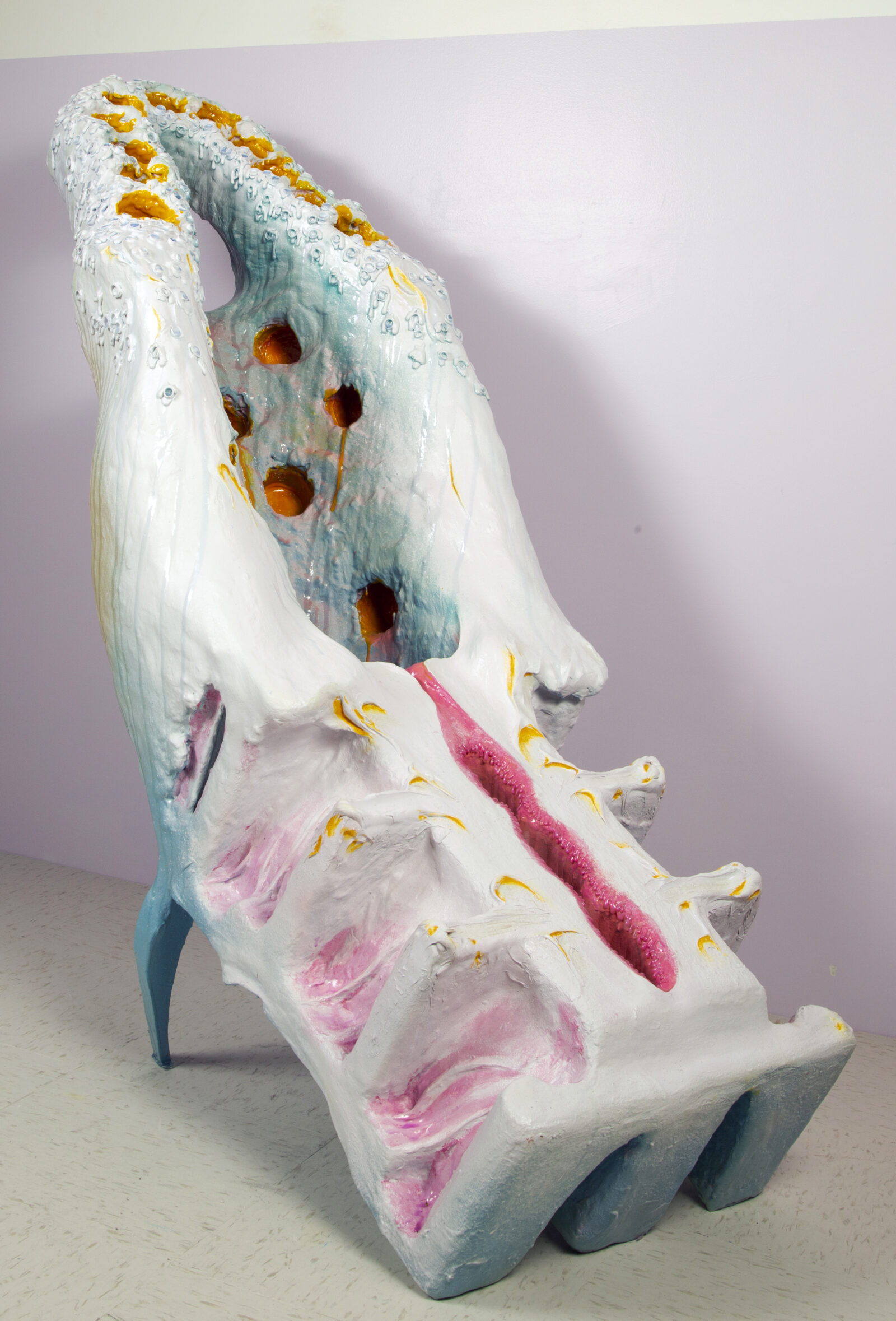 Now, Nobles thinks of As I Sit Waiting as ongoing. She has completed twenty extraordinary sculptures and, as of December 2025, two more are in-progress in her East Harlem studio. Each is an uncanny chair or seat that maintains the space in which vulnerable bodies might sit or recline, soliciting a range of affective responses, from tension to exuberance, from pain to disgust to joy. Each sculpture is named after someone who wanted or had an abortion and responds, in its materiality and form, to a conversation Nobles had with that person. And each sculpture speaks, as I have suggested elsewhere, with a vocabulary of inclination, accentuating overlooked and understated postural comportments of waiting, sitting, laying, and lying. Julie (2022, figure 1) leans back gently into space, a narrow seat coated in thick synthetic paste, painted white with blushes of pink and blue, and balanced on two little legs. Half-orbs secreting golden liquid indent its back and headrest. A candy-pink crevice undulates in three connected ovals down its base. Jade (2022, figure 2) squats low to the ground. Shimmering medusa-green acrylic, inflected with purple and pink, coats every eclectic surface. Its armrests are draped in tangles of rubber tubing; its backrest is full of holes.