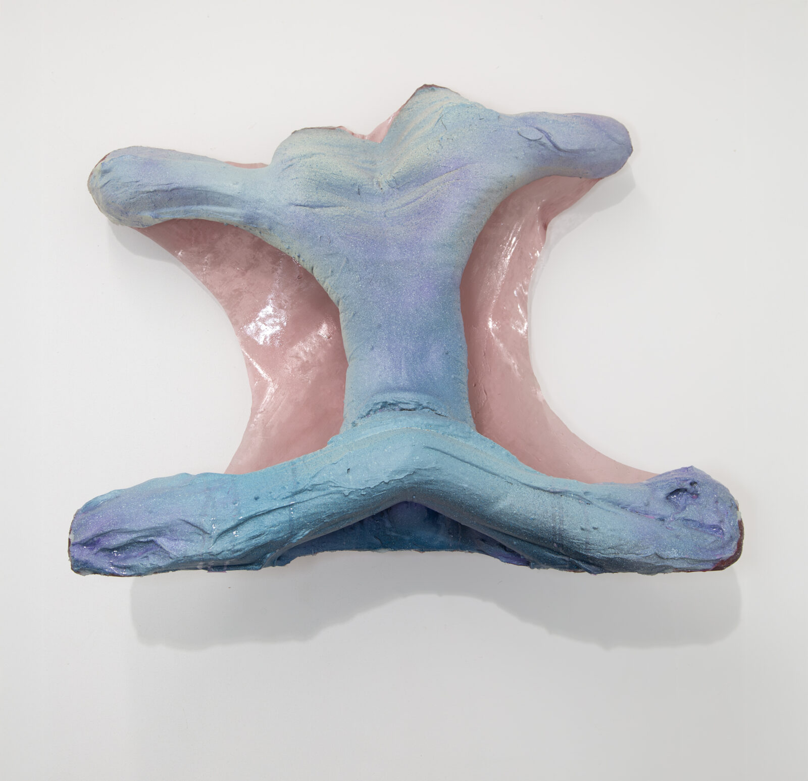 In contrast with the sense of prolonged temporality and postural inertia of the sculptures in As I Sit Waiting, the Pleasure Trophies are defiantly insubordinate. They pulse with unbeholden pleasures. Using many of the same materials as in As I Sit Waiting, Nobles’s Pleasure Trophies translate the weight that would ground a bottom to a chair into the suspension of sensuous partial bodies. She mounts them high up on the wall, covetable prizes of a hunt without precedent. Pleasure Trophy II (2024, figure 3) is at once ethereal and insistently corporeal, delicate and engorged. A translucent veil of pink silk, hardened with clear acrylic, lies behind a plump foam appendage that splays out gently and shimmers in Nobles’s signature palette of pastel-purple on the cusp of baby-blue, medusa-green, and pink. Consistently working with colors, materials, and shapes that read “feminine,” Nobles embraces feminizing stereotypes to the point of rupture. She shamelessly invigorates a feminist tradition of the “abstract erotic.”3