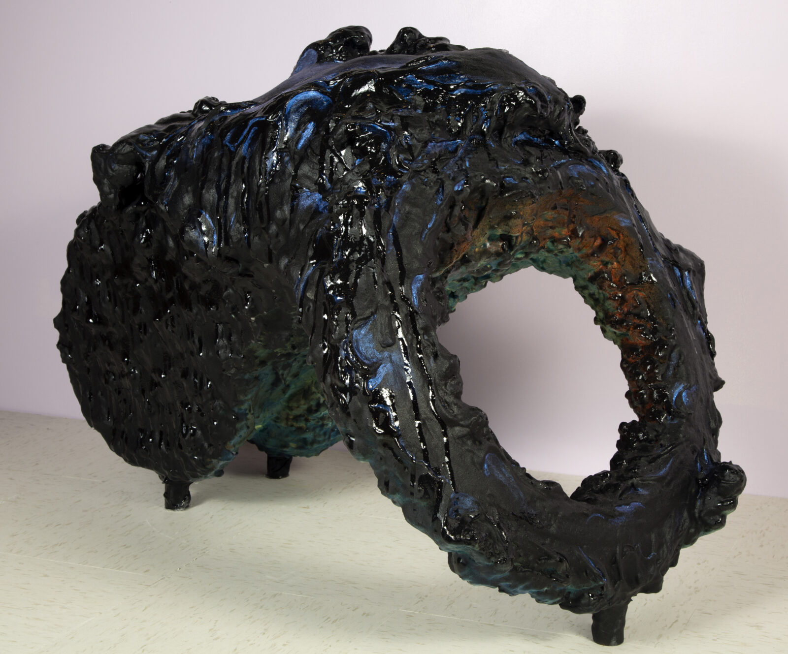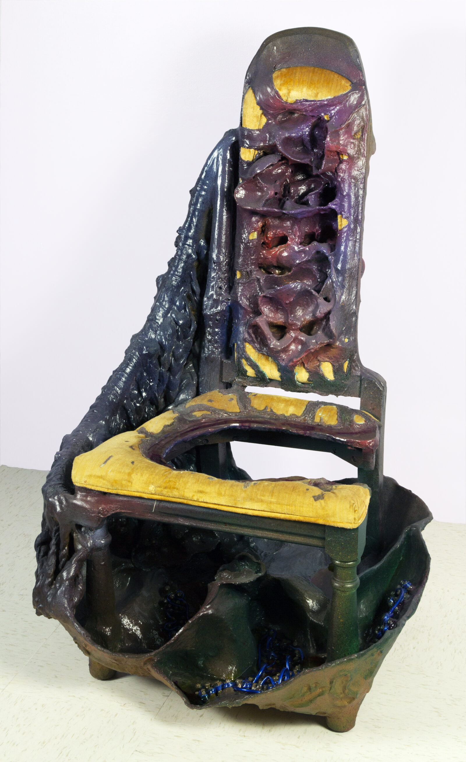 Nobles’s sculptures exhibit the continuity of this history in the present.11 As I Sit Waiting does so in modest yet uncanny seats that maintain, in the absence of bodies, space for those variously “condemned” (to use Federici’s verb) by the legal tradition. Velvette (2022, figure 4) is a short three-legged seat with an iridescent dark green underside and knobby black surface. Without arms and without a back, it is an uncanny spatial remainder of a supine body laid out vulnerably in space. Ginger (2022, figure 5), a salvaged wooden chair with worn velvet upholstery, is missing parts of its narrow back and seat and partially encased in opalescent purple resin. Loose braids of rubber and thin lengths of rope, coated in thick acrylic paint, wrap around and dangle from its single arcing arm. Blue rubber tubing threads through little nubs of resin protruding from a veil that wraps around it, giving the impression of being burnt or melted but also sheathed. These sculptures defy their own material fragility. They patiently persist.