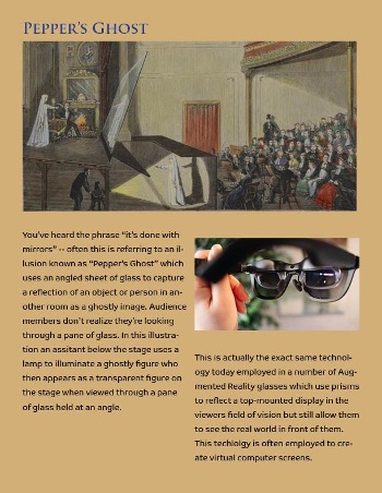 Furthermore, for the spiritualists and for the XR creators, technology has been particularly useful in mediating the coexistence of the seemingly incompatible; for instance, the technological strategy that superimposes figures viewed through a pane of glass held at an angle (see Pepper’s Ghost below) is still often employed to create virtual computer screens and augmented reality glasses.