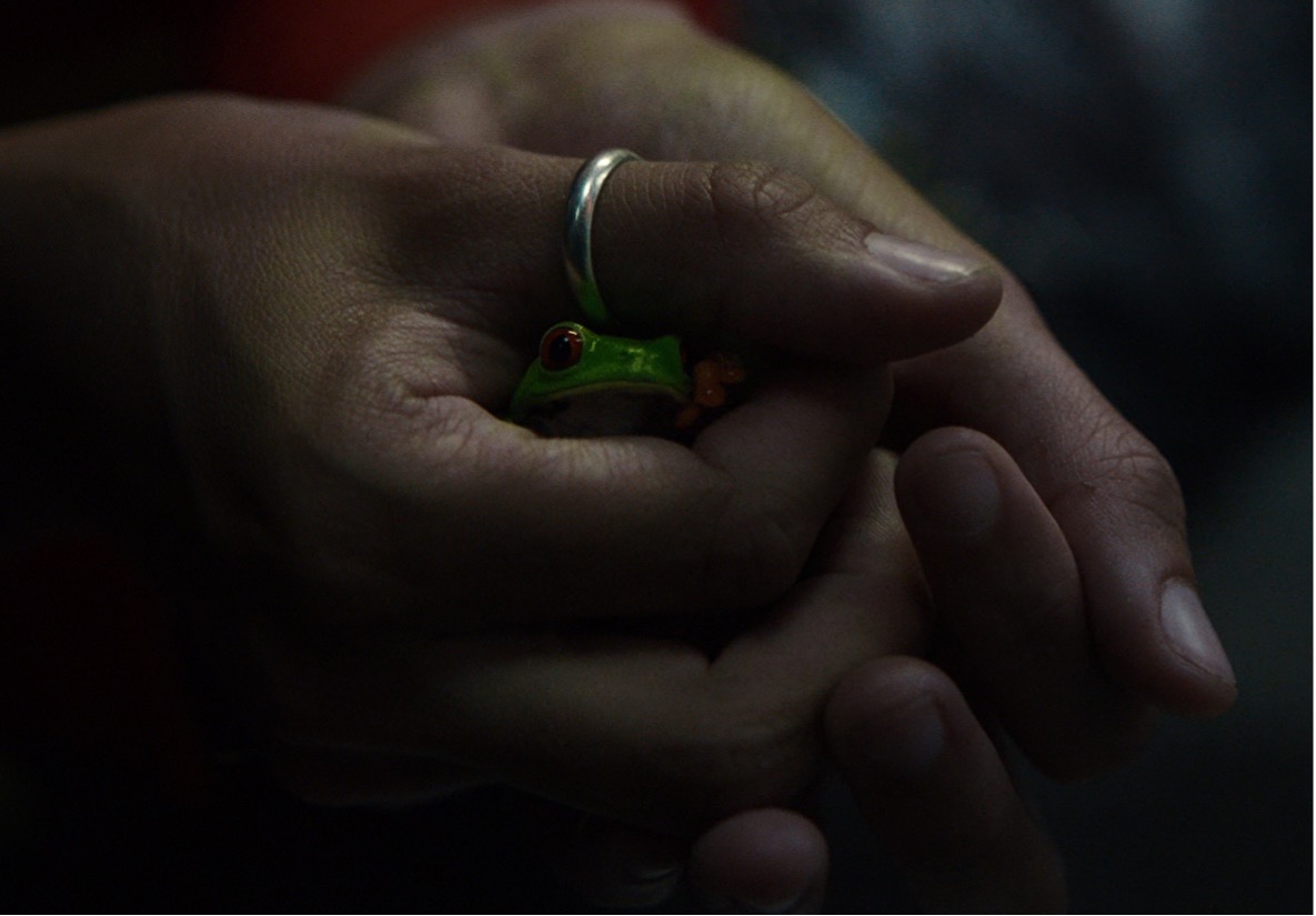 This realization becomes pressing toward the end of the film, when the smoke coming from the exterminators’ machines visually erases the family’s belongings (Figure 6), and the camera switches to show the parents and the daughters walking together, quietly, on an empty street—like ghosts. In the last shot, Josefina appears holding in her hand the only survivor of the frog massacre, its red eyes peeking out of the fist being the last thing we see, and the last thing that sees us (Figure 7). The frog’s survival could be read as the survival of memory, the sound it holds within constituting the acoustic and ghostly remnant of the Caracas the characters might never see again. This reading would be yet another example of the many ways in which “animals are overdetermined within human imaginaries.”27 Instead, I propose that we read that frog, not for everything it could be and mean, but for what it actually is: a displaced animal, a creature that is not where it is supposed to be, an involuntary actor in a story that ended up being its own story. Its silence—for the first time in the film, the frog is not singing—stages an encounter with “countless worlds of perception which are forever closed to us,” and as it fuses with the silence of the family members, it creates a commonality, a something shared between them that reframes this new chapter of their life not in terms of nostalgia, adaptation, or forgetting, but in light of what it means to live with the unsaid: with that which escapes knowledge and which escapes us.28 That which does not need translation. A mode of living that can be a painful shortcoming, but that can also be an opening toward finding belonging somewhere beside or beyond clear narratives of origin, and the comfort (and the violence) of what is familiar and familial.