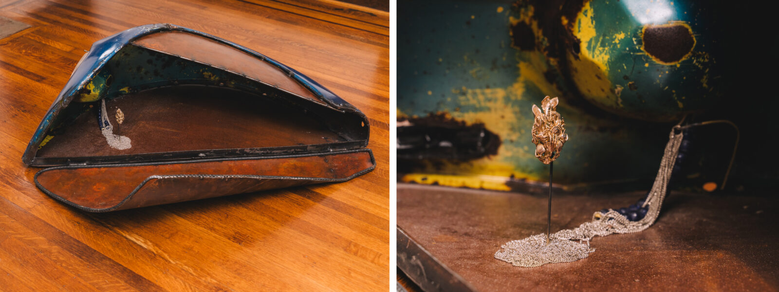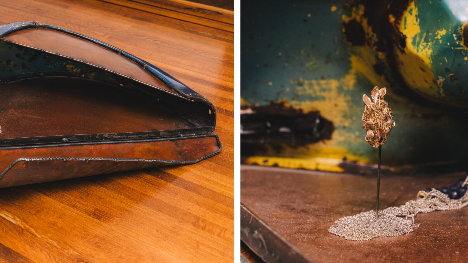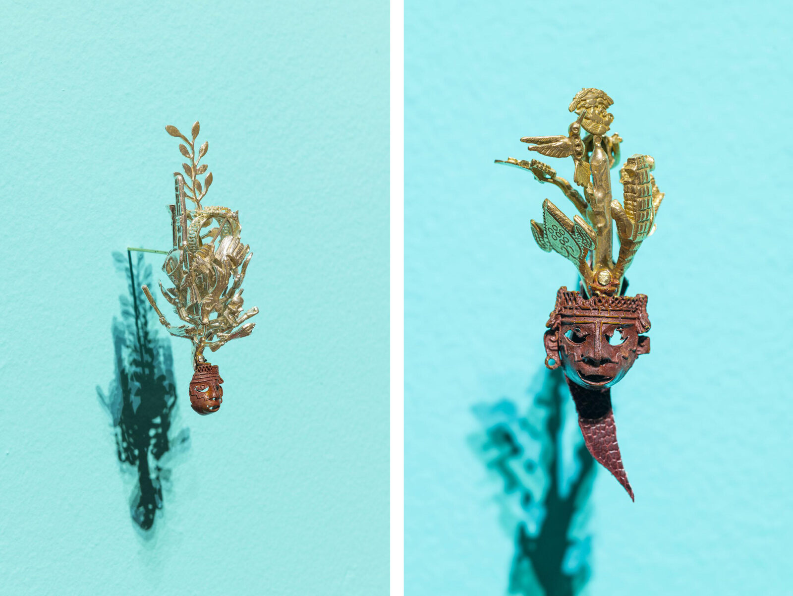 Hernández Vargas began work on Lost wax after studying goldsmithing, a technical repertoire that connects him with his grandfather, who worked as a jeweler between 1950 and 1985. These kinships are not metaphors. They are about joining this and this and that. The artist tells me that jewelry negatives often combine several wax models around a shared empty core which, metal. Figures are then severed from it, borders burnished, carefully erasing traces of a shared common root. With this series, Hernández Vargas seeks, however, to make those common origins visible by maintaining the infrastructures that the otherwise shiny, solemn, and somewhat funny pieces share. As I look at another one, I understand better. From a lush silver tree grow trumpets and hammers, Aztec masks and lilies, pliers and leaves, frogs and a caterpillar. In these surrealist pieces lives the sympathetic magic of juxtaposition. So much richness in joining things side-by-side, instead of separating them further.