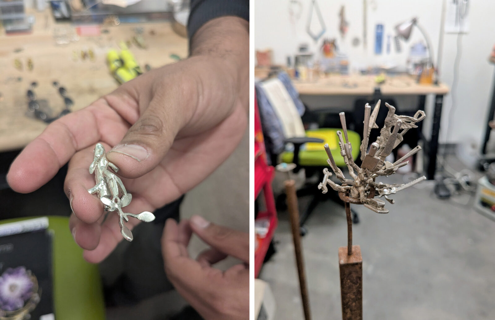 The piece of silver that he rubs with his thumb is part of Lost Wax, a growing series of small-scale sculptures that the artist has been working on since 2022. It’s a minimal right hand, relaxed, with its index finger pointing, a hand that grows from a tree trunk with a severed branch. On the joint between hand and trunk there is a tiny lapislazuli chip. One inch long, the miniature rotates in his fingers. This one is related to this other one, he shows me. And I see in between his fingertips another silver trunk with what seem like nopal leaves growing from one of its branches.