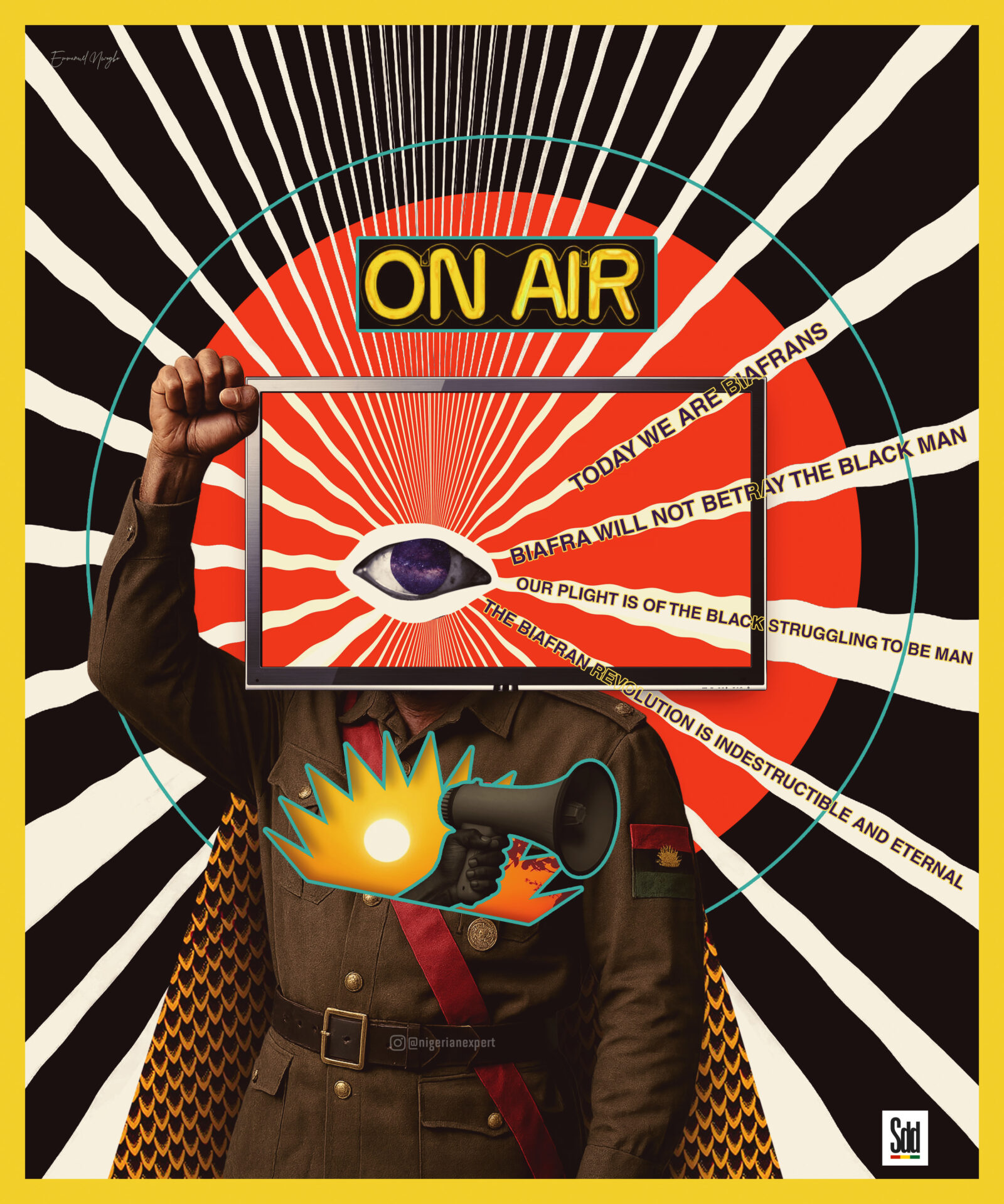 Attending to the relations between Biafran leaders and the Western journalists and publicists, our images foreground the instrumentalization of crises by transnational elite-classed subjects, as collaborators within the circuit of humanitarian cultural production. Biafran leaders adopted two main propaganda approaches: one targeted inward at Biafran subjects and the other directed outward to the international community. Our first montage represents the former strategy through a proto-nationalist subject in a Biafran uniform, a fist raised in the air. Before this subject is the Biafran sun with an accompanying speaker. And where the subject’s face should be, we find an outline of a TV screen with an eye in the middle. In the background of the image is an orange circle with white rays streaming outwards from the eye. Along the rays are embedded quotes detailing the Biafran struggle: “Today we are Biafrans,” “Biafra will not betray the black man,” “Our plight is of the black struggling to be man,” and “The Biafran revolution is indestructible and eternal.” These quotes are pulled directly from the Ahiara Declaration (1970), a speech delivered by the Biafran leader, Colonel Odumegwu Ojukwu, at the tail end of the war. Drafted by the Biafran intelligentsia, comprised of Igbo artists and scholars, the text is ideologically heavy-handed and is often seen as a propaganda tool. The work points to the Biafran narrative of Black African self-determination that the Biafran leadership rhetorically employed throughout the war, while also reimagining Biafran propaganda through a speculative aesthetic.
