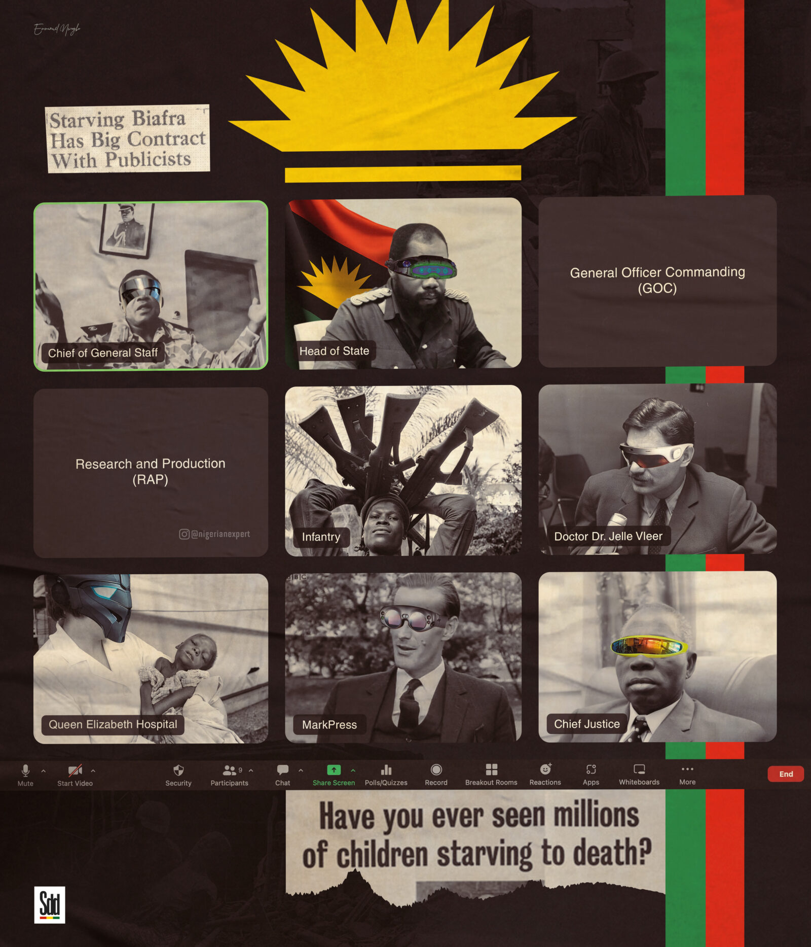Our second montage highlights the collaboration between key leaders through the depiction of a virtual meeting. This conceptual meeting features a representative of Markpress, members of the Biafran leadership (including Chief of General Staff Major General Phillip Effiong, head of state General Chukwuemeka Odumegwu Ojukwu, General Officer Commanding Alexander Madiebo, and Chief Justice Sir Louis Mbanefo), the Biafran arms manufacturing Research and Production institute, Dutch medical doctor Dr. Jelle Vleer (of Terre Des Hommes), and a nurse holding a Biafran child at the Queen Elizabeth Hospital. The Biafran flag, with its prominent half of a yellow sun and green and red stripes, along with two headlines that read “Starving Biafra has big contracts with Publicist” and “Have you ever seen millions of children starving to death?,” serve as a backdrop for this virtual meeting. The singular representation of the Biafran mass can only be located in the sickly child: she is the starving Biafran, and unsurprisingly, she is incapacitated and rendered mute. With the exception of the infantry, all the meeting attendees don eyewear that signals their integration within this modernized, hyperbureaucratic engagement. The nurse’s face shield acts as a protective barrier that signals a pernicious racial coding, distancing whites from Blacks. Here, the nurse-child photograph serves as a key representation of the humanitarian visuals that emerged during this conflict, one that signals whiteness as the embodiment of health and vitality, distanced from the Black other and the heart of darkness from which this crisis unfolds, and positioned as the unsung heroes of the Biafrans.