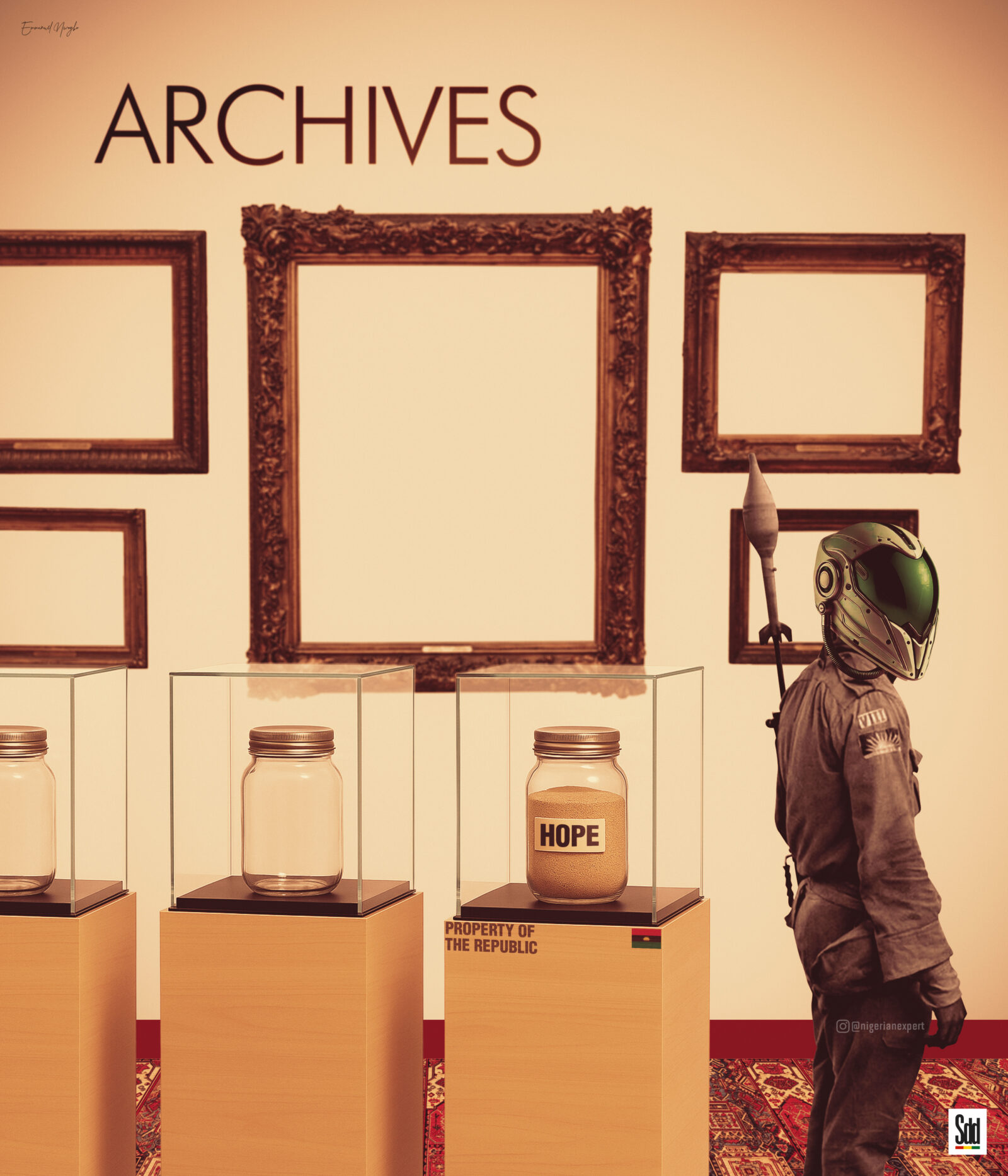 Our final artwork offers a postscript of the war. In it, a subject in a Biafran military uniform dons a galactic-inspired futuristic helmet and wields a rocket-propelled launcher, ceremoniously, like a staff. Evoking postapocalyptic regalia, the artwork registers a pessimistic conclusion to the Biafran story. It is spectral. The subject stands amidst a gallery of empty frames and jars, with the exception of a sand-filled jar that is labelled “Hope.” This jar rests on a stand with the inscription “Property of Biafra,” registering hope as a contaminant to be cordoned off, but also admired by an infinitely objectifying gaze. Once an aspiration, the Biafran nation becomes archived, contained within a gallery for one’s viewing pleasure. Despite the Biafran self-conception and its strategic pantomimic redeployment of colonial-era stereotypes, the war’s decisive implication—made evident by the secessionists’ failure to sustain independence—ultimately exposes the enduring power asymmetries between the West and Africa that shape the visual economy of suffering. The nation once reliant on its own objectification is indefinitely cast into this role: a self-devouring ouroboros. And, as viewers and audiences captivated by the siren call of spectral images, we are left to reflect on our own complicity.