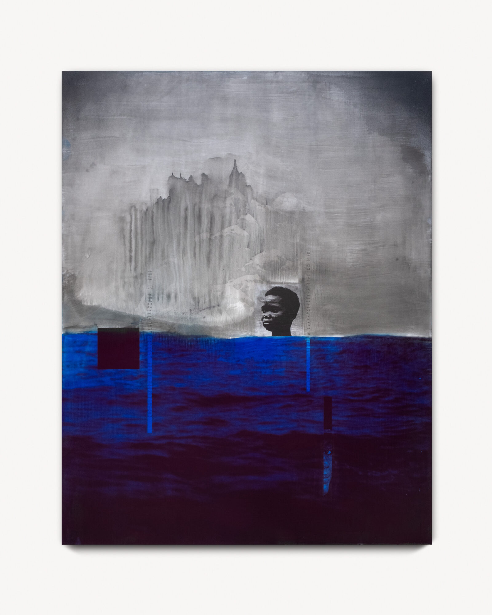 For Beryl Wright (2021) is a diptych of an ocean landscape with gradient blue streaks that give the painting texture. One side of the painting is a dark blue image of a foggy glacier, while the other side is a lighter image of an ocean-scape with opaque brush strokes appearing like heavy rain. The texture blurs the scene, replicating frigid Arctic conditions. Upon closer inspection, some of those streaks are not brushstrokes but are strips of writing taken from Simpson’s findings in publications in the mid-to-late twentieth century. The pieces of writing appear through cracks of blue, leaving most of the story hidden. The sliver of writing instills curiosity and invites the viewer to co-imagine the fuller story. Simpson’s themes of speculation are seen through the withholding of the entirety of the sources, forcing viewers to desire something more and to imagine what more could be—like a fiction.9 In this way, she cultivates an art practice that honors Black life as communal, historical, and not fully for public consumption.