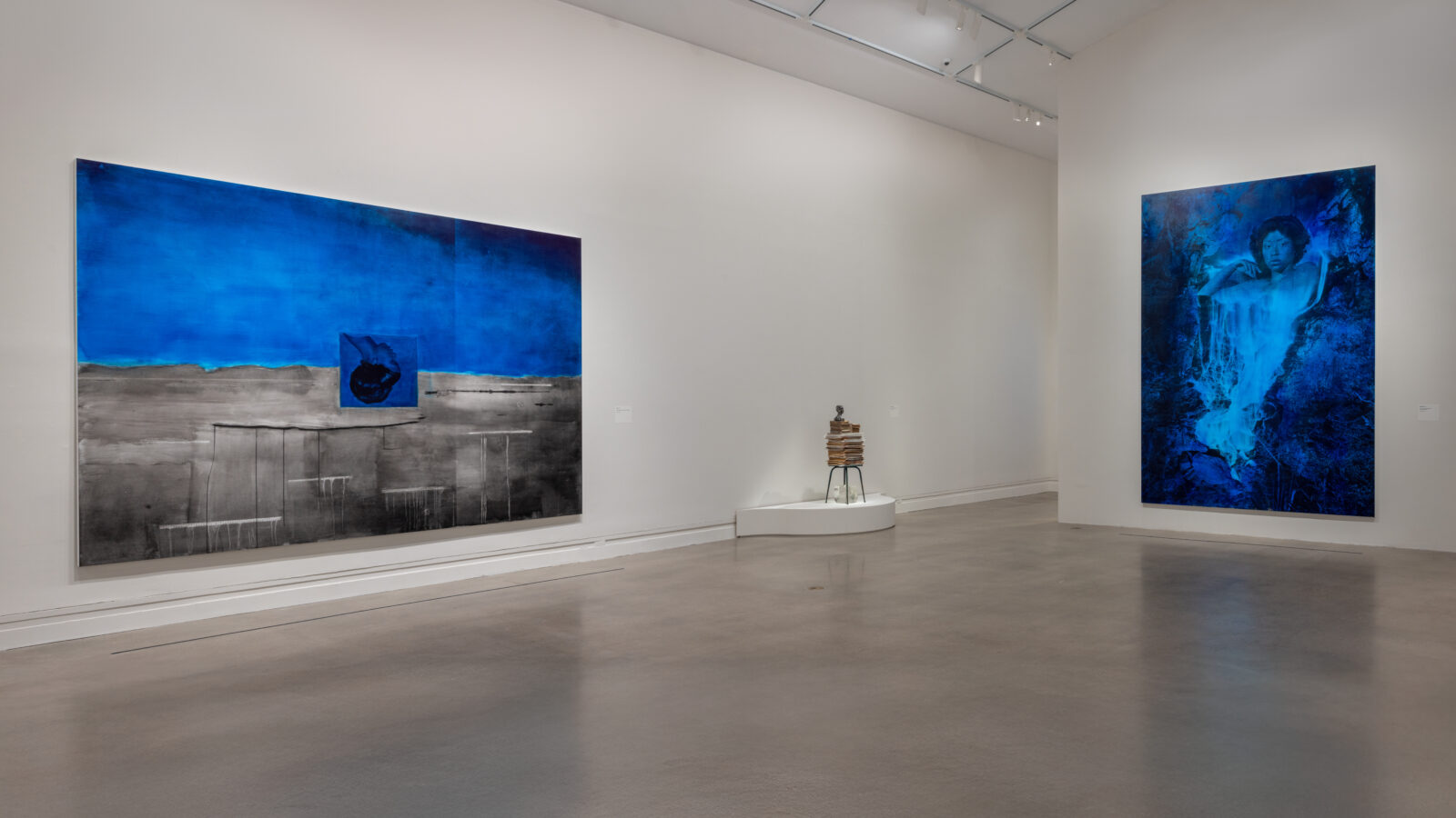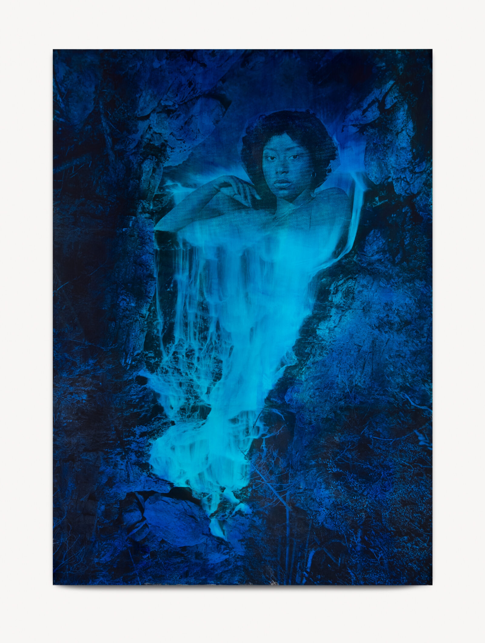 The collaged paintings show Black women’s faces peering out of mountainous cliffs, bodies of water, and cloudy skies. This adds complexity to representing the racial and gendered subjectivities of Black women showing Black women subjects revealing themselves on their terms. Specific Notation (2019) is an ink and screen print of a Black woman seductively looking out to the viewer. We can only see her face partially. Her eyes, nose, and top of her forehead peak out from underneath the textures of dirt and rock. Specific Notation mirrors Night Fall (2023) on two freestanding walls, respectively. Night Fall shows a Black woman with feathered short hair and full lips looking down towards the viewer with soft, firm eyes. We have visual access to only the head, neck, right arm, and shoulders of her body. The lower half of her body becomes a cascade of lava. The bright blue streams are blurred and made translucent with fog and light, making the painting glow. The stream flows down a rocky mountain. The light glows all around her making her even more powerful and godly. The blues, blurs, and calm-yet-piercing gaze feel sincere although she is surrounded by what I would assume to be frightening conditions.