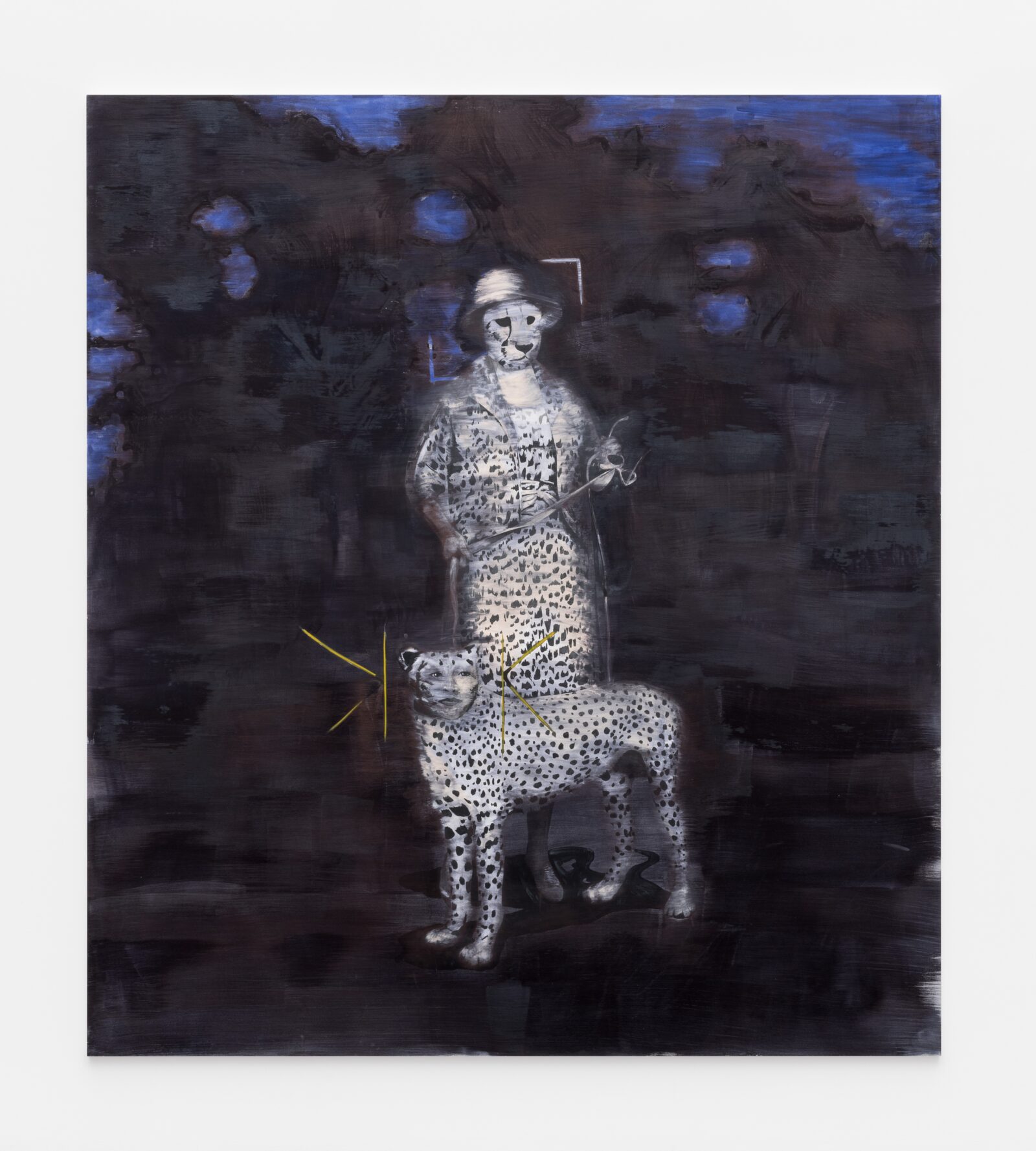 Shifting from conceptual photography, Simpson is now widely recognized for her practices of collaging and painting mid-to-late-twentieth-century Black models in galactic, godly, animalistic, and eerie settings. Ghosts and haunting also call attention to the ways Simpson’s visuals—the subject matter, colorways, brushwork, and collage techniques—provoke curiosity, seducing viewers to investigate what isn’t clear.7 Across her works, Simpson conjures Black communal desires to experience otherworldly, not-quite-here, and more-than-human embodiments. Simpson leans into surreal visuality, fragmentation, hybridity, and abstraction to offer representation of Black women that, as bell hooks suggests, give “poetic expression to the ethereal, and prophetic dimensions of visionary souls shrouded in flesh.”8 In many of the paintings in this exhibition, clandestine source images and documents are noticeable only upon careful scanning of the large paintings, and even then there are fragments that aren’t fully visible. Simpson makes viewers work for information, yet even diligent searching doesn’t disclose everything.