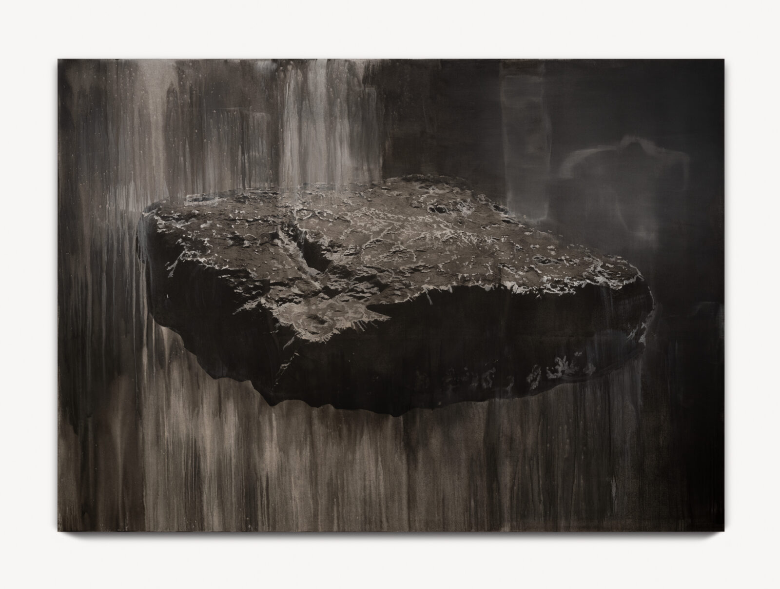 Edwards sees something ghostly in Simpson’s work with meteorites, such as in did time elapse (2024), which depicts a singular large, long rock with distinct ridges and craters staged at the center of the painting, while the background is a streaky blur of grey and white. Edwards reflects on how Simpson captures these ungraspable moving bodies in outer space, noting that the “shadowy yet glimmering” visual of a meteorite body calls upon the “phantoms, haunting, and apparitions” that the objects allude to—namely the experience of Ed Bush, a Black man from Mississippi who felt the sensation of a meteorite falling near him in 1922. In archival recordings of this rare event, Bush is barely mentioned—he is a ghost haunting what we know about these mysterious galactic rocks.12