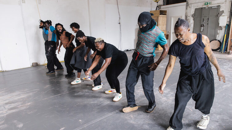 About an hour into nora chipaumire’s Dambudzo, a musical shift brings several performers to an area in the middle of Les Chaudronneries: they stride into a line and proceed with a quietly jubilant dance. There is a gameful sociality that flutters across the row of performers, as they rhythmically scuff one foot out in front of the other, pouring their weight forward inch by inch, testing how much extension their balance can endure, before withdrawing to more sturdy equilibrium. The dancers eventually drift into a more scattered formation, moving in comfortable unison through a sequence of shuffles forward and back. They sway with an arm raised, then tread buoyantly backward, make a quarter twirl, and repeat the phrase.