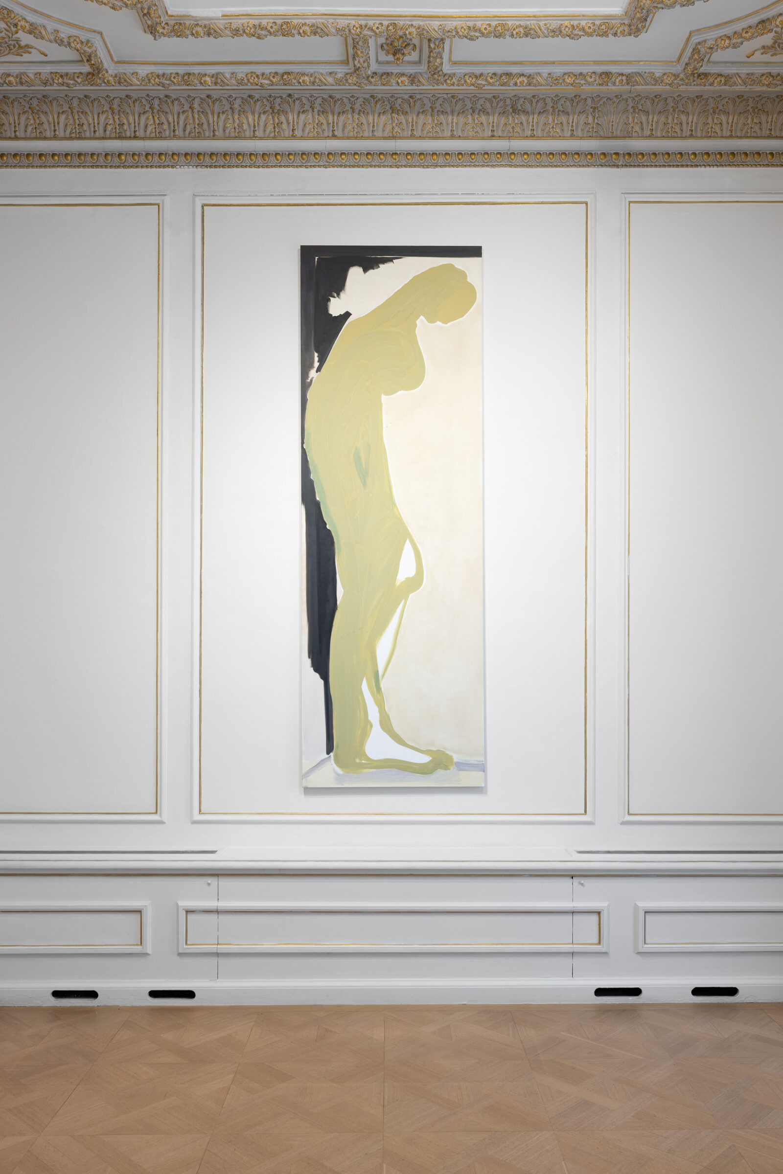 A painting featuring a large green figure stands in profile, slightly hunched and rounded at the back, enveloped by a patchy black and off-white color background.