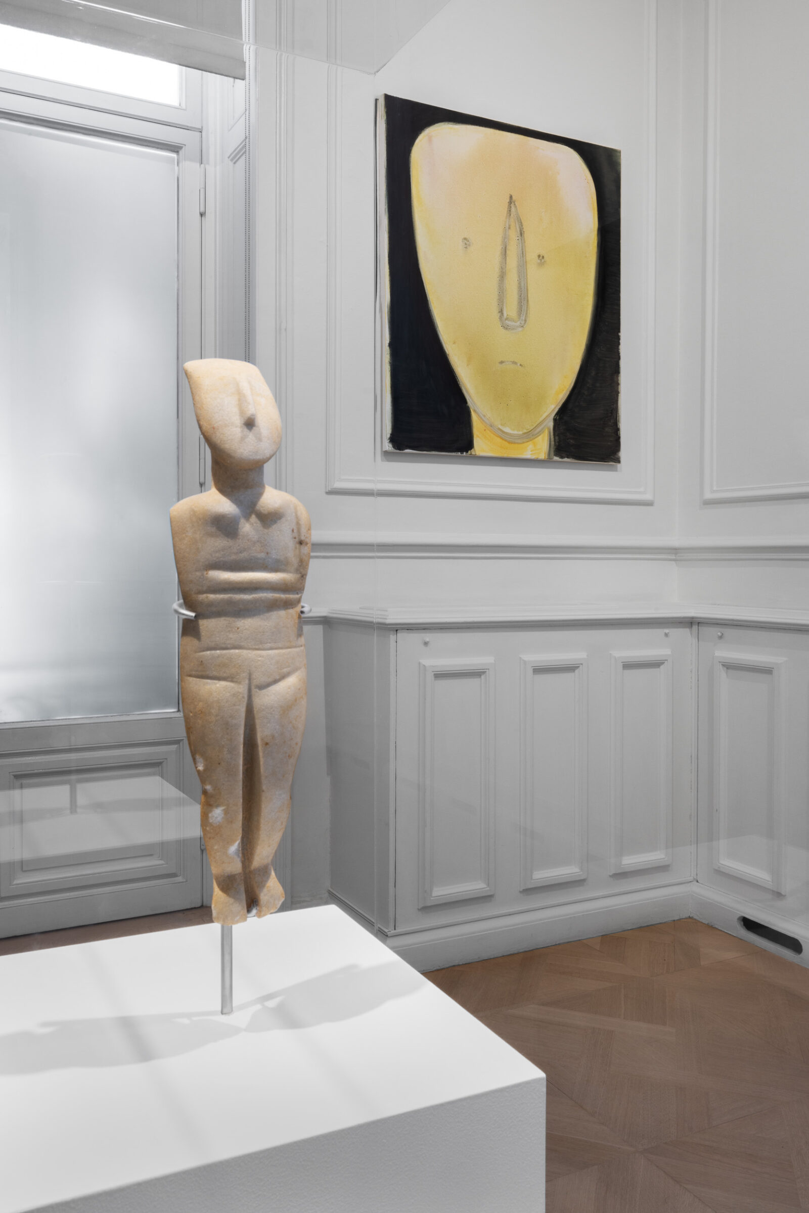 In front of the painted figure, in a separate work, is a marble geometric figurine. Smooth, naked, arms folded, a seemingly female-presenting body based on indications of breasts and an incised pubic triangle. If you look from afar, the works are in direct conversation with one another, through a deliberate curatorial conversation that physically places aesthetically or visually similar works next to one another. Indeed, even another figurine (a torso and thighs of a female figurine) is adjacent to the painted green figure. Approach them from a different direction in the space or individually, and the figures seem estranged and aloof, no longer in visual conversation with one another.