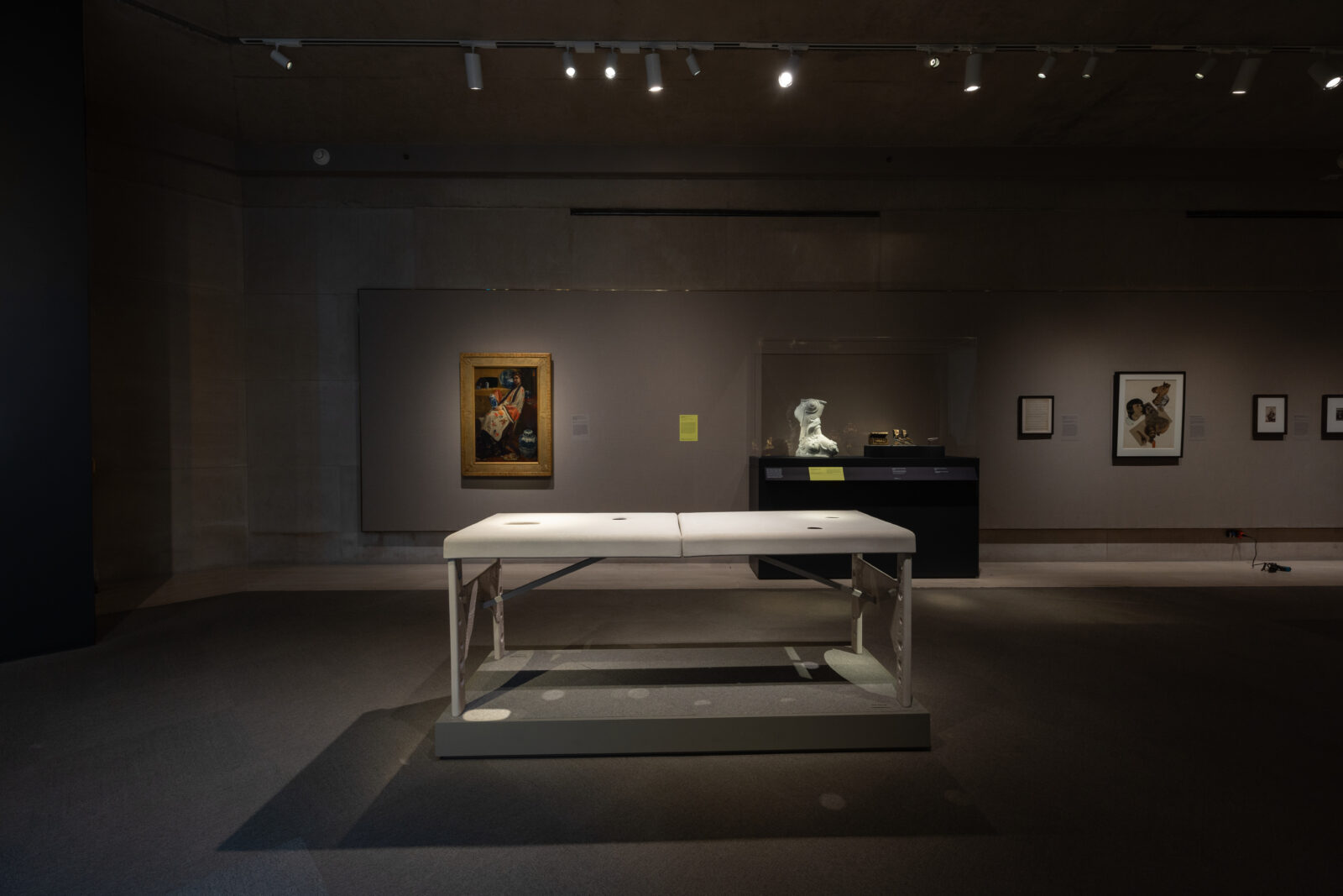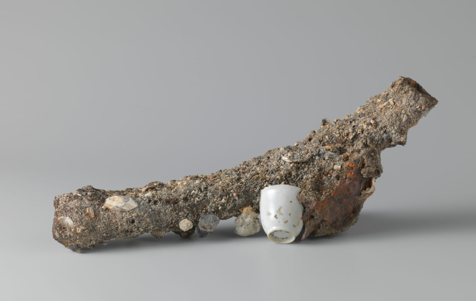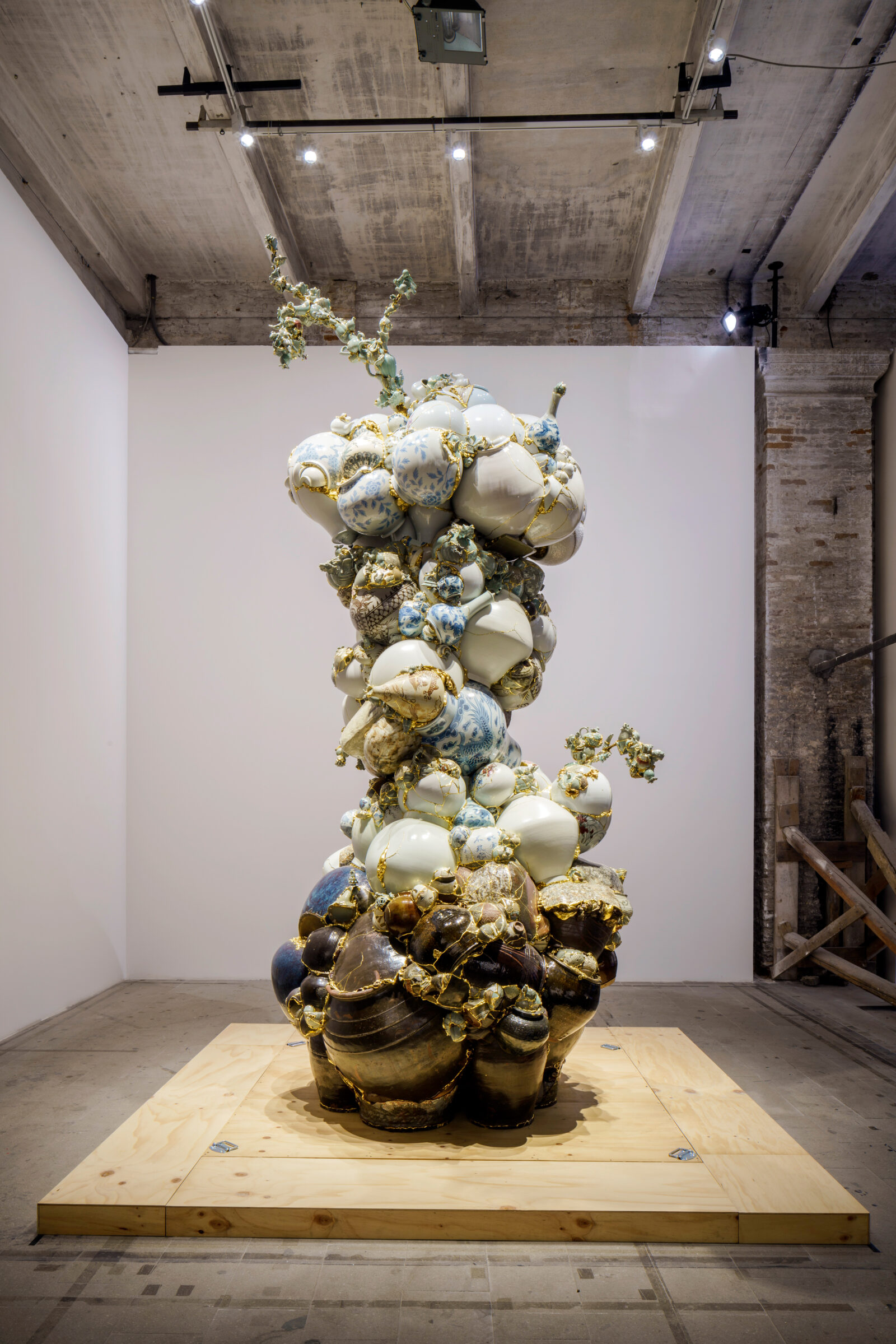 The circular show Monstrous Beauty: A Feminist Revision of Chinoiserie begins and ends with two ceramic vestiges that trace the shifting politics of porcelain. The first is a piece of sea sculpture (Figure 1)—a hybrid form of marine invertebrates, ship fragments, and a porcelain cup recovered from the wreck of the Witte Leeuw (White Lion), a three-masted trade ship owned by the Dutch East India Company that sank in the South Atlantic Ocean in 1613. The second soon-to-be vestige is Patty Chang’s Abyssal: Massage Table (2025) (Figure 2), a full-size porcelain table punctured by holes and glazed only on its underside. Chang’s piece invokes the unseen labor of Asian women spa workers and will be sunk in the Pacific Ocean after the exhibition closes to serve as a deposit for growing coral.