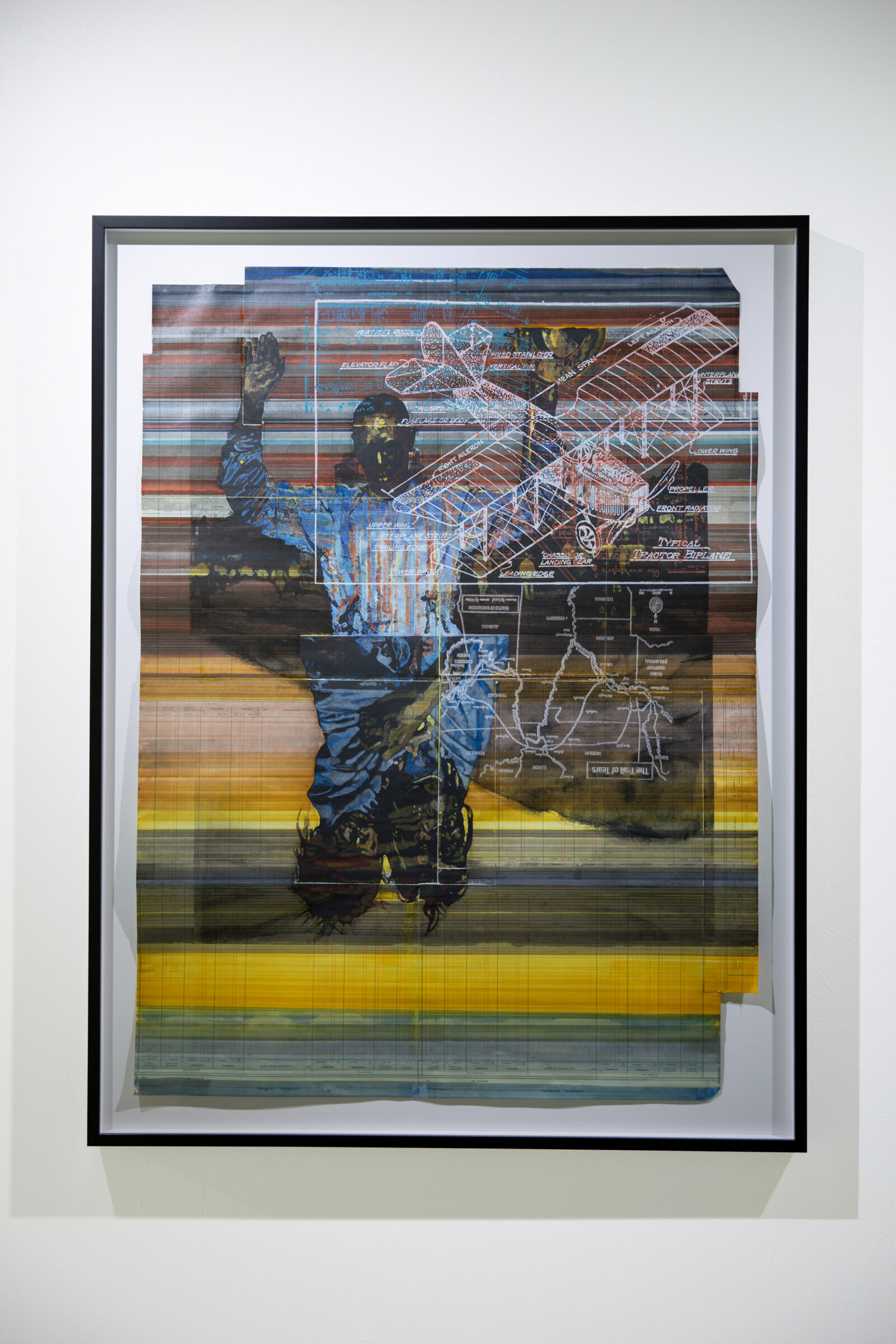 Many artists draw formal connections between the struggles united by slow catastrophe. People previously kept apart by capital or top-down initiatives of race-making recognize their shared vulnerabilities to disaster and rediscover shared histories of struggle. Rodney Ewing’s Come the Mean Times sutures the upper body of a Black man with hands raised to two inverted Native figures (fig. 3). Visually linking the Trail of Tears, a genocidal episode of land theft, to the Tulsa Massacre, a murderous policing of racial difference, Ewing makes one the mirror of the other. The work is rendered on a material substrate of ledger paper, evoking the medium that incarcerated Native artists—like Gokliz—used in the nineteenth century. The curators give these decisions some historical heft by reproducing a spread of archival finds from the Newberry Library’s collections, showing how radical periodicals such as The Black Panther, Akwesasne Notes, and Winter Soldier circulated the same images of events in the early seventies like the occupation of Wounded Knee. Ewing’s work suggests an artful counterpart in the present to the “unlikely coalitions” of the past (STLW, 48).6