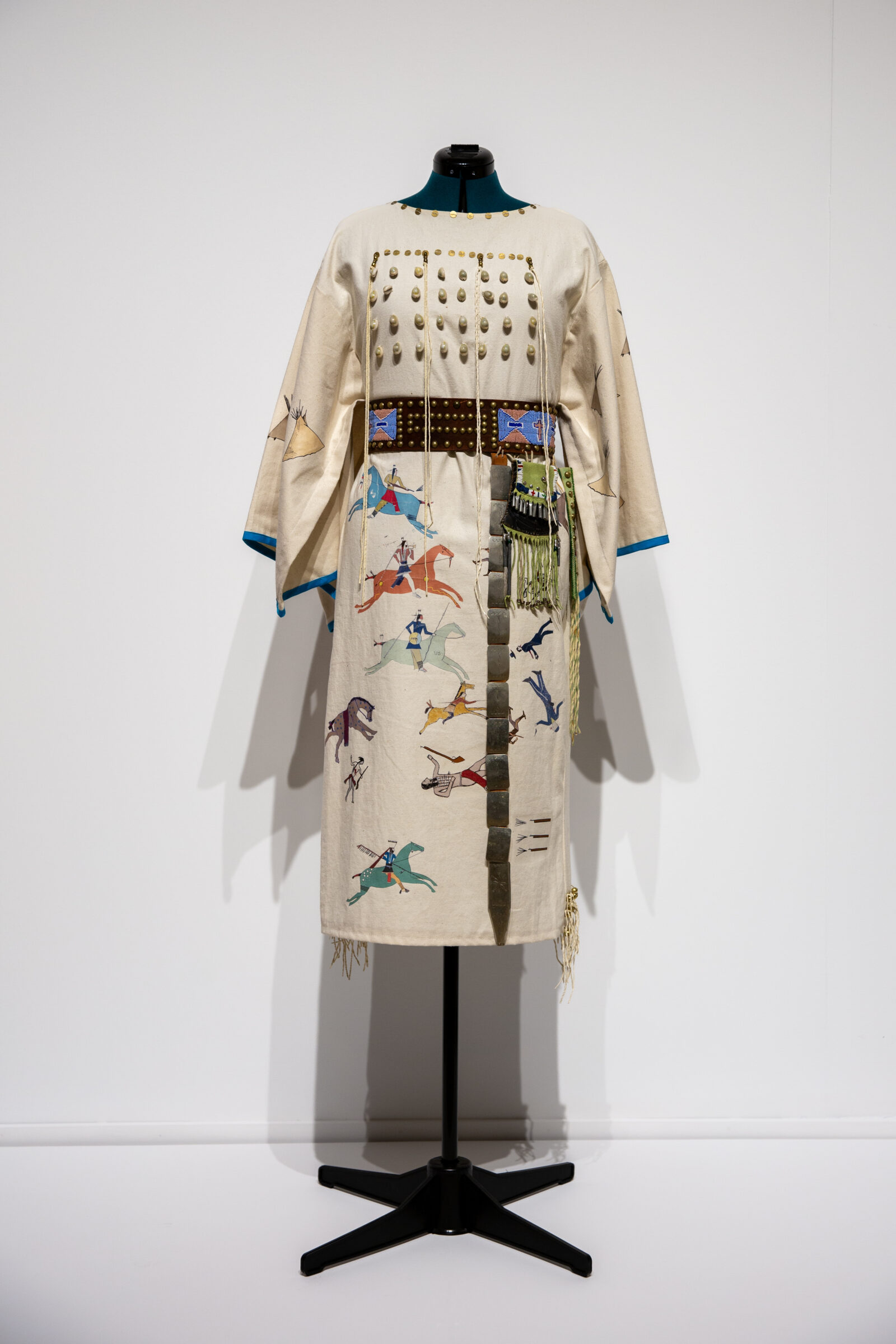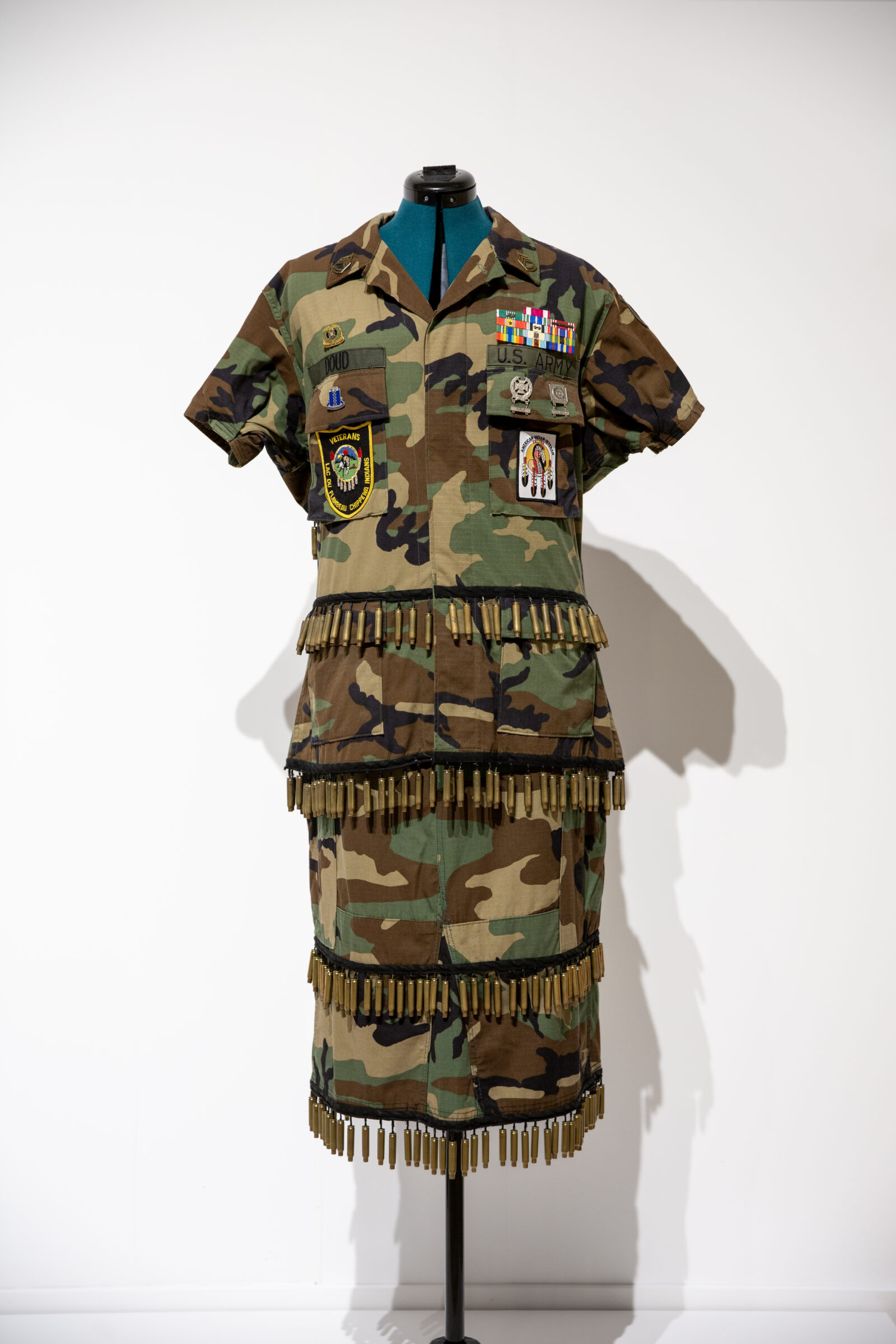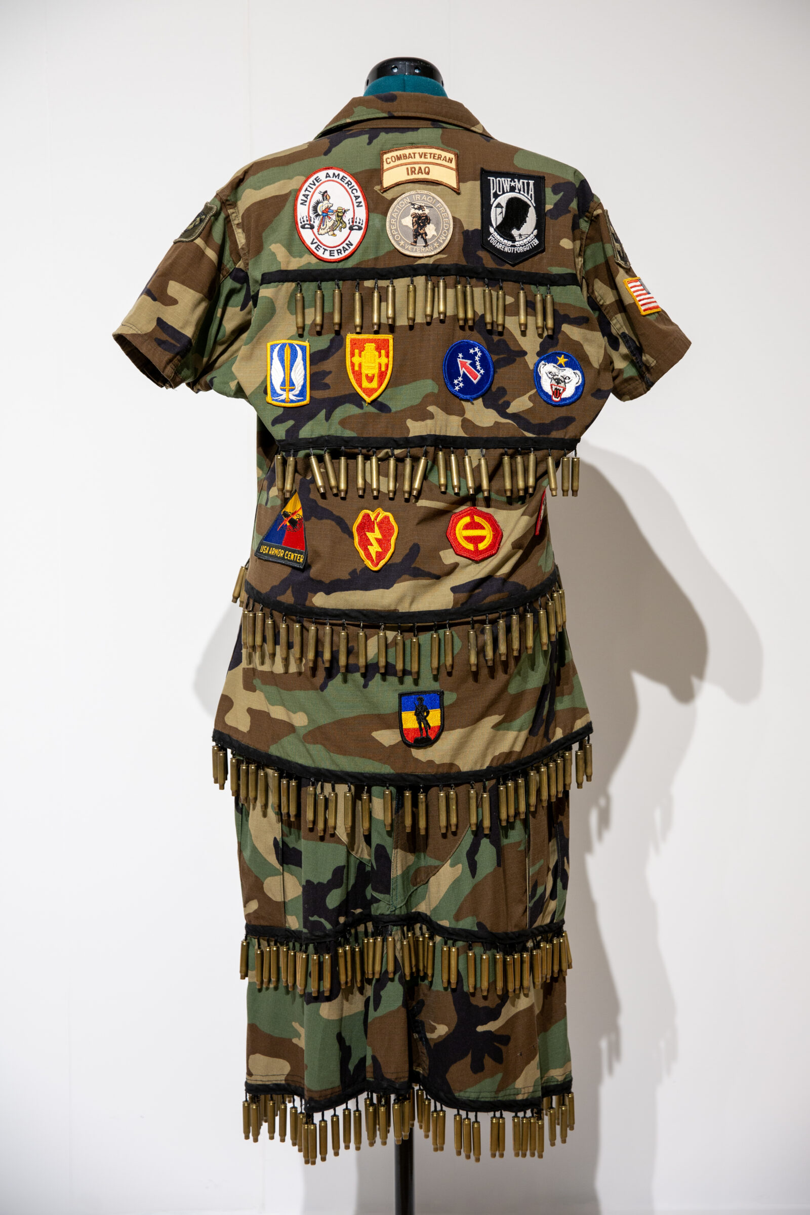 A key point made throughout Surviving the Long Wars is that it’s often tough to disentangle the perpetrators and victims of harm caused by U.S. empire. Veterans are often both at once. Miridith Campbell (Kiowa) served in the U.S. Marines, Army, and Navy. Her striking battle dress features ledger-style drawings depicting the 1864 defeat of Kit Carson by Kiowa warriors, doomed soldiers tumbling down the wearer’s body (fig. 4). And Melissa Doud (Ojibwe)’s Bullet Dress turns a military uniform into a jingle dress adorned with spent casings and twenty years’ worth of service patches earned by the artist (fig. 5). Deconstructing uniforms into traditional garments, Campbell and Doud expose the martial logics that press Native histories and lives into the service of violence against other “host nationals” (STLW, 70-1).