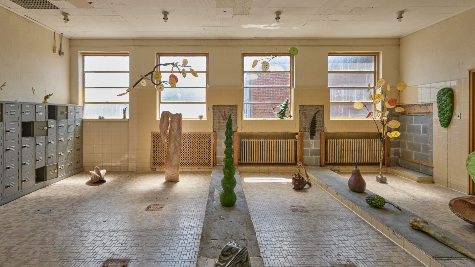 Crossing the gymnasium, I turn into a small adjoining room. A hinged metal panel stands before a wall of cement blocks, the white paint unable to conceal the roughness beneath its surface. Underfoot, a mosaic of uneven beige tiles recalls a restroom more than a gallery. To the left, a hand sink, a drinking fountain, and a black paper towel dispenser line a wall barely two feet wide, beside a urinal and a closed toilet stall. Across from them, a stripped locker room area unfolds. Inhabiting this space are sculptures by the late artist Ming Fay (1943—2025), rendered in sap green, Naples yellow, cadmium red, rose madder, and light ochre—ambiguous forms resembling branches, seeds, roots, fruits, or organisms that appear to have sprouted from the ruins of the decrepit room itself. The sculptures are simultaneously lit by the cool artificial glare of fluorescent bulbs on the ceiling and the warm natural sunlight filtering through panes of glass, veiled in differing opacities. The pale-yellow room feels quietly comforting on a Sunday afternoon, even as its tiled walls radiate a lingering chill. The timeworn yet reanimated architecture invites, and then unsettles, the museum-goer’s eye.