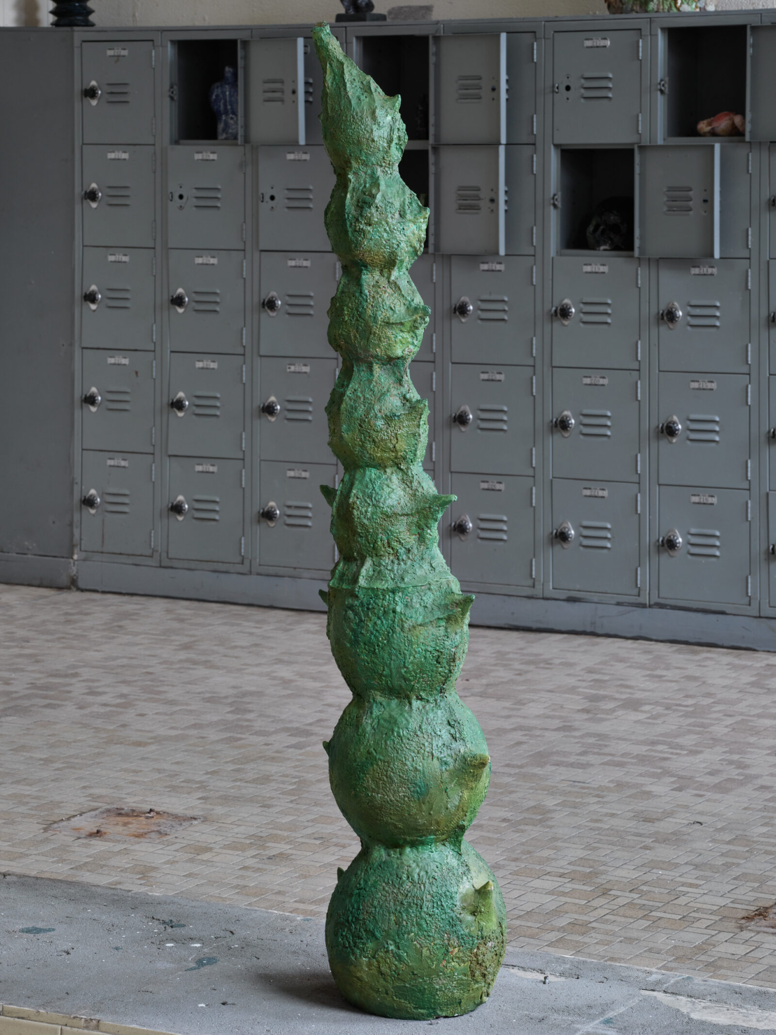Through curatorial decisions made by Timo Kappeller in collaboration with Parker Tao Fay, Ming Fay’s studio manager, the sculptures were placed throughout the former locker room in ways that activate the room’s architectural remnants.4 A wall of gray metal lockers has been repurposed as a series of display cases, each fitted with a small light that frames the handmade objects like specimens or relics. What once stored sweaty clothes and worn shoes now shelters Fay’s glazed ceramic figures, seeds, and Jungle Doodads, turning the apparatus of profane storage into one of sacred preservation and memory.5 Two rectangular cement remnants marking the site of the room’s former benches sit at the center of the space, now functioning as pedestals whose rough surfaces echo the textures of Fay’s painted forms. On one of them rest the enlarged sculptures Pear (2021), Lychee (c. 2000s), and an untitled bone-shaped work (1992). On the other rises Untitled (Prickus Group), a hybrid green form whose clustered spiky bulbs diminish in size as they reach to the ceiling, like new leaves unfurling to forcibly bring the room’s architecture back to life. This motif of growth through taking root recurs in Fay’s sketchbook drawings, where organic forms begin by anchoring themselves to the ground before unfurling upward. Beside it, on a lighter patch of concrete inset with worn wooden boards, rests the oversized ceramic nut, its surface catching the light as if softly glowing.