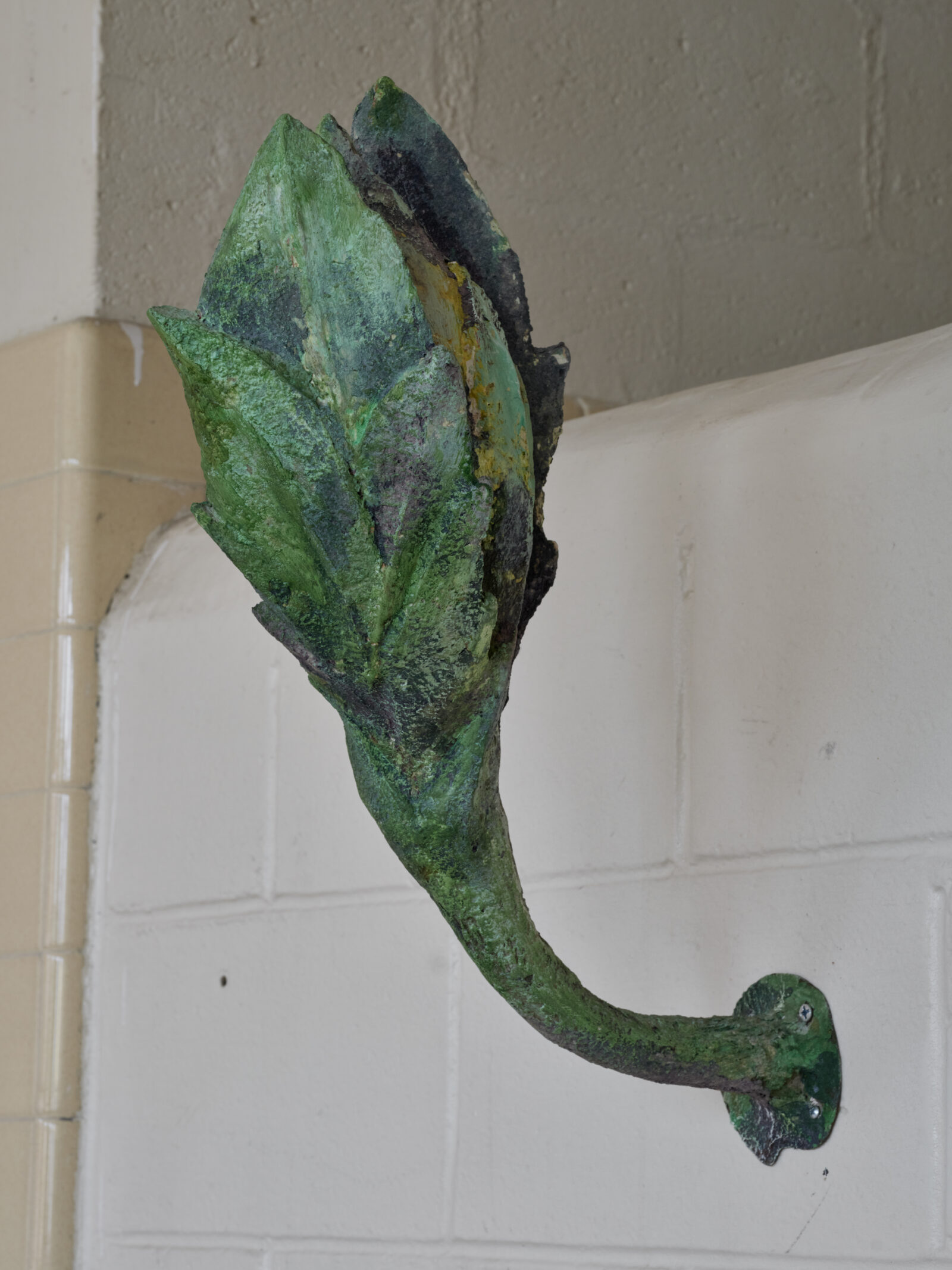 When approached spatially, Fay’s sculptures move beyond readings of cultural identity alone, working dialogically with their environments to open architectural settings and shape how viewers move through and experience space. Across his career, Ming Fay consistently worked through close attentiveness to the specific spatial conditions of his sites. In Canutopia (2012) at the Grounds for Sculpture, for example, Fay worked within a space whose ceiling network of water pipes, air vents, and uneven walls complicated the installation’s organic geometry. In the locker room at The Campus, such responsiveness allows the sculptures to merge even more intimately with the space’s residual architecture outside the paradigms of the proverbial white cube. The sculptures’ enlarged, fleshy surfaces exude an uncanny vitality within the somewhat sterile tiled confines, where galvanized pipes and exposed wiring reveal the building’s utilitarian anatomy in all directions.